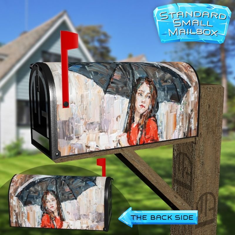 Dressing up your rural farm mailbox with the Girl in the Rain with Umbrella mailbox cover is an easy way to convert it into a unique and special item. These covers require a smooth surface, so they are compatible with rural farm mailboxes that do not have any embossed decorations or signs. Magnetic mailbox covers work with steel boxes only, while self-adhesive vinyl covers are available for aluminum, plastic and steel boxes. If your mailbox is not compatible with these covers, you can purchase a brand new mailbox with a preinstalled cover. Additionally, you have the option to create a custom rural farm mailbox cover with your own pictures, name, street number, etc.