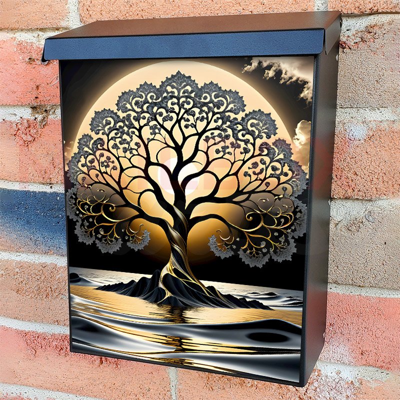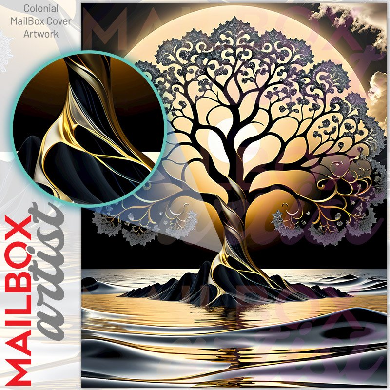 With this Gold and Grey Zen Tree in the Lake colonial mailbox cover it’s pretty easy to convert your mailbox to a special and unique item. These covers require a flat surface, so they work with colonial mailboxes that do not have any embossed decoration or signs. Magnetic mailbox covers work with steel colonial boxes only, while self-adhesive vinyl covers are available for aluminum, plastic and steel boxes. We also offer both self-adhesive and magnetic covers with regular opaque white vinyl or reflective vinyl, which works similarly to license plates or road signs. The reflective option makes the entire cover’s surface reflective, ensuring visibility at night. In case your mailbox doesn’t work with these covers, you can purchase the preinstalled cover on a brand new mailbox as well. Also, you can create your custom colonial mailbox cover using you own pictures, adding your name, street number, etc.
