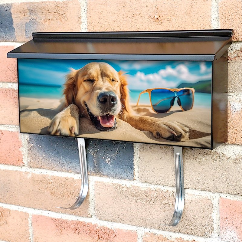 Applying your Golden Retriever Dog On Summer Vacation townhouse / ranch mailbox cover it’s pretty easy to convert your mailbox to a special and unique item. These covers require a flat surface, so they work with townhouse / ranch mailboxes that do not have any embossed decoration or signs. Magnetic mailbox covers work with steel boxes, for aluminum and plastic boxes we offer the self-adhesive vinyl covers. In case your mailbox doesn’t work with these covers, you can purchase the preinstalled cover on a brand new mailbox as well. Also, you can create your custom townhouse / ranch mailbox cover using you own pictures, adding your name, street number, etc.