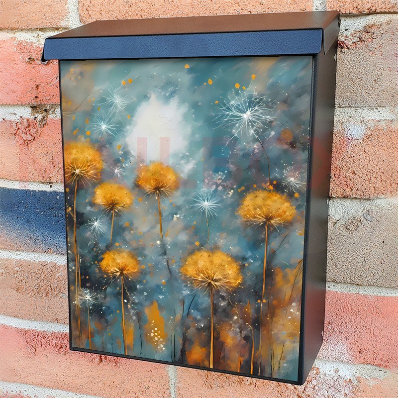 With this Gorgeous Abstract Dandelions colonial mailbox cover it’s pretty easy to convert your mailbox to a special and unique item. These covers require a flat surface, so they work with colonial mailboxes that do not have any embossed decoration or signs. Magnetic mailbox covers work with steel colonial boxes only, while self-adhesive vinyl covers are available for aluminum, plastic and steel boxes. We also offer both self-adhesive and magnetic covers with regular opaque white vinyl or reflective vinyl, which works similarly to license plates or road signs. The reflective option makes the entire cover’s surface reflective, ensuring visibility at night. In case your mailbox doesn’t work with these covers, you can purchase the preinstalled cover on a brand new mailbox as well. Also, you can create your custom colonial mailbox cover using you own pictures, adding your name, street number, etc.