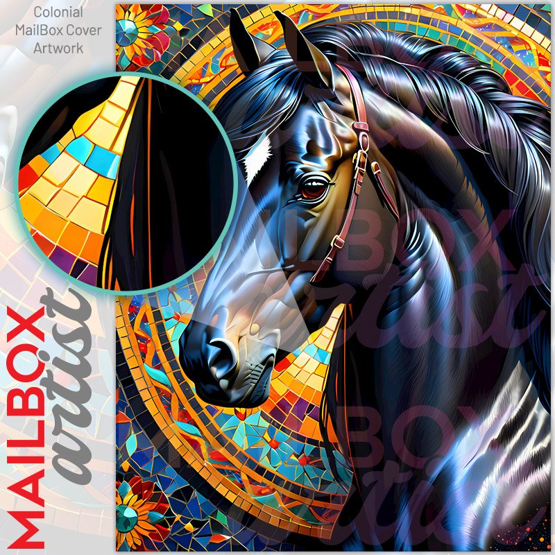 With this Gorgeous Mosaic Black Horse colonial mailbox cover it’s pretty easy to convert your mailbox to a special and unique item. These covers require a flat surface, so they work with colonial mailboxes that do not have any embossed decoration or signs. Magnetic mailbox covers work with steel colonial boxes only, while self-adhesive vinyl covers are available for aluminum, plastic and steel boxes. We also offer both self-adhesive and magnetic covers with regular opaque white vinyl or reflective vinyl, which works similarly to license plates or road signs. The reflective option makes the entire cover’s surface reflective, ensuring visibility at night. In case your mailbox doesn’t work with these covers, you can purchase the preinstalled cover on a brand new mailbox as well. Also, you can create your custom colonial mailbox cover using you own pictures, adding your name, street number, etc.