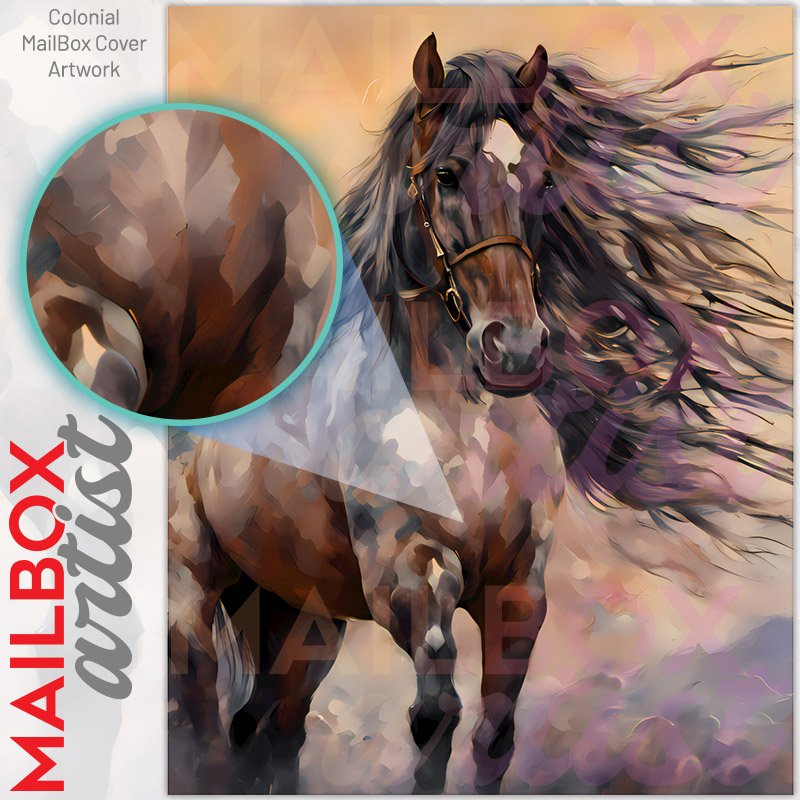 With this Gorgeous Native Horse colonial mailbox cover it’s pretty easy to convert your mailbox to a special and unique item. These covers require a flat surface, so they work with colonial mailboxes that do not have any embossed decoration or signs. Magnetic mailbox covers work with steel colonial boxes only, while self-adhesive vinyl covers are available for aluminum, plastic and steel boxes. We also offer both self-adhesive and magnetic covers with regular opaque white vinyl or reflective vinyl, which works similarly to license plates or road signs. The reflective option makes the entire cover’s surface reflective, ensuring visibility at night. In case your mailbox doesn’t work with these covers, you can purchase the preinstalled cover on a brand new mailbox as well. Also, you can create your custom colonial mailbox cover using you own pictures, adding your name, street number, etc.