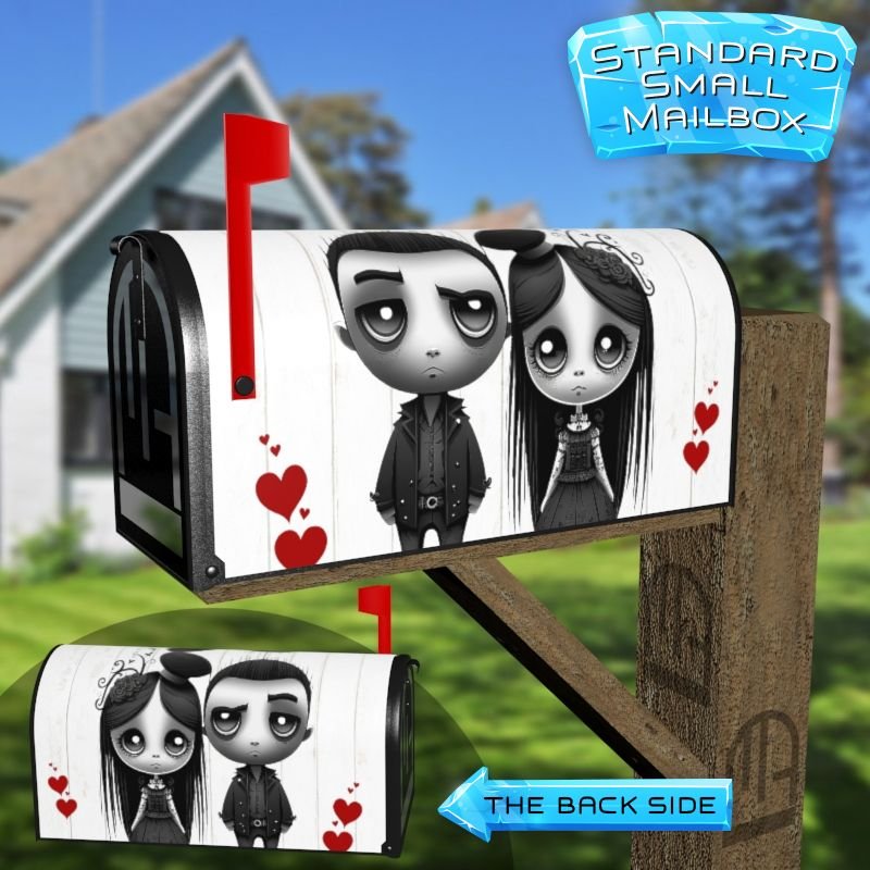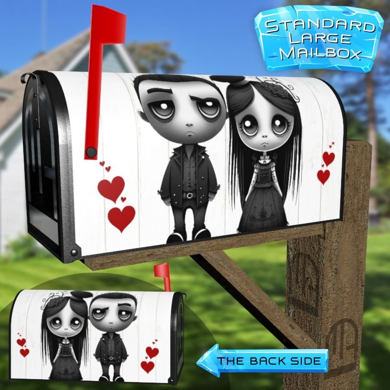 Dressing up your rural farm mailbox with the Gothic Valentine’s Day Couple mailbox cover is an easy way to convert it into a unique and special item. These covers require a smooth surface, so they are compatible with rural farm mailboxes that do not have any embossed decorations or signs. Magnetic mailbox covers work with steel boxes only, while self-adhesive vinyl covers are available for aluminum, plastic and steel boxes. If your mailbox is not compatible with these covers, you can purchase a brand new mailbox with a preinstalled cover. Additionally, you have the option to create a custom rural farm mailbox cover with your own pictures, name, street number, etc.