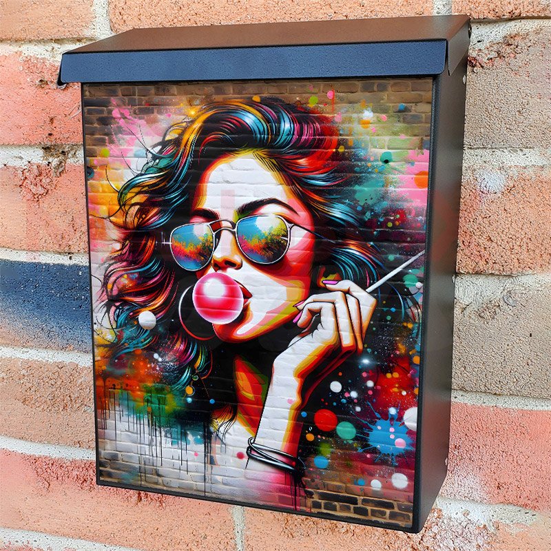 With this Graffiti Girl with a Bubblegum colonial mailbox cover it’s pretty easy to convert your mailbox to a special and unique item. These covers require a flat surface, so they work with colonial mailboxes that do not have any embossed decoration or signs. Magnetic mailbox covers work with steel colonial boxes only, while self-adhesive vinyl covers are available for aluminum, plastic and steel boxes. We also offer both self-adhesive and magnetic covers with regular opaque white vinyl or reflective vinyl, which works similarly to license plates or road signs. The reflective option makes the entire cover’s surface reflective, ensuring visibility at night. In case your mailbox doesn’t work with these covers, you can purchase the preinstalled cover on a brand new mailbox as well. Also, you can create your custom colonial mailbox cover using you own pictures, adding your name, street number, etc.
