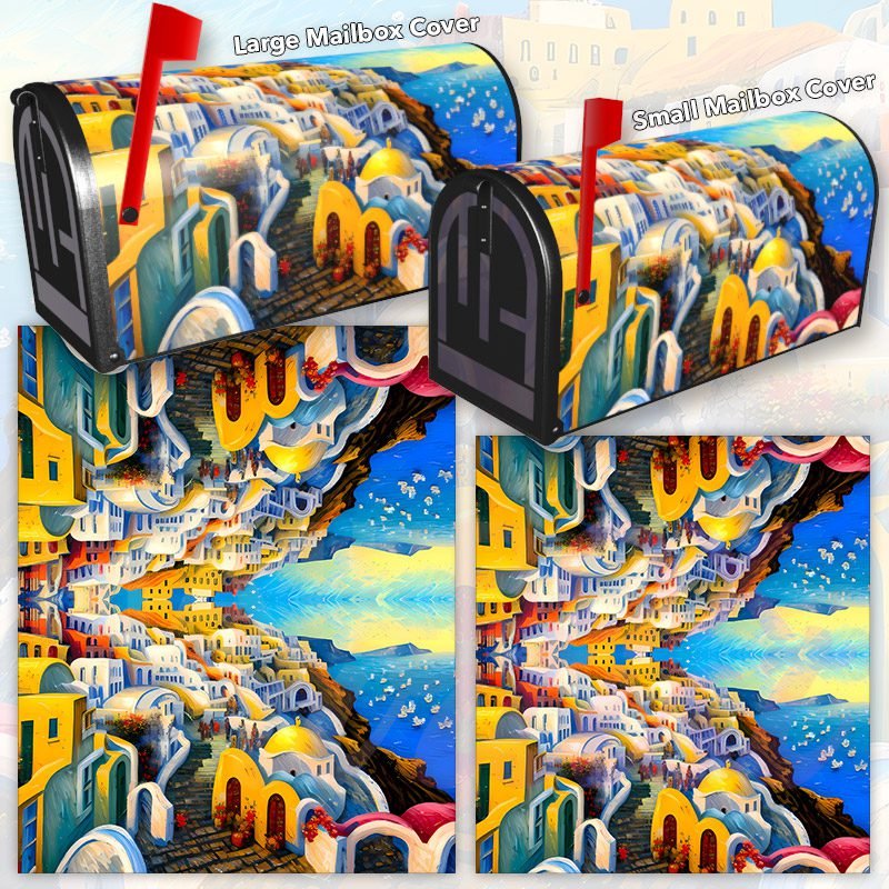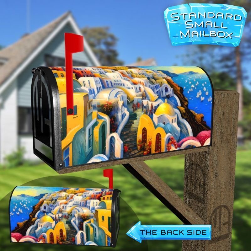 Dressing up your rural farm mailbox with the Greece, Santorini #3 mailbox cover is an easy way to convert it into a unique and special item. These covers require a smooth surface, so they are compatible with rural farm mailboxes that do not have any embossed decorations or signs. Magnetic mailbox covers work with steel boxes only, while self-adhesive vinyl covers are available for aluminum, plastic and steel boxes. If your mailbox is not compatible with these covers, you can purchase a brand new mailbox with a preinstalled cover. Additionally, you have the option to create a custom rural farm mailbox cover with your own pictures, name, street number, etc.