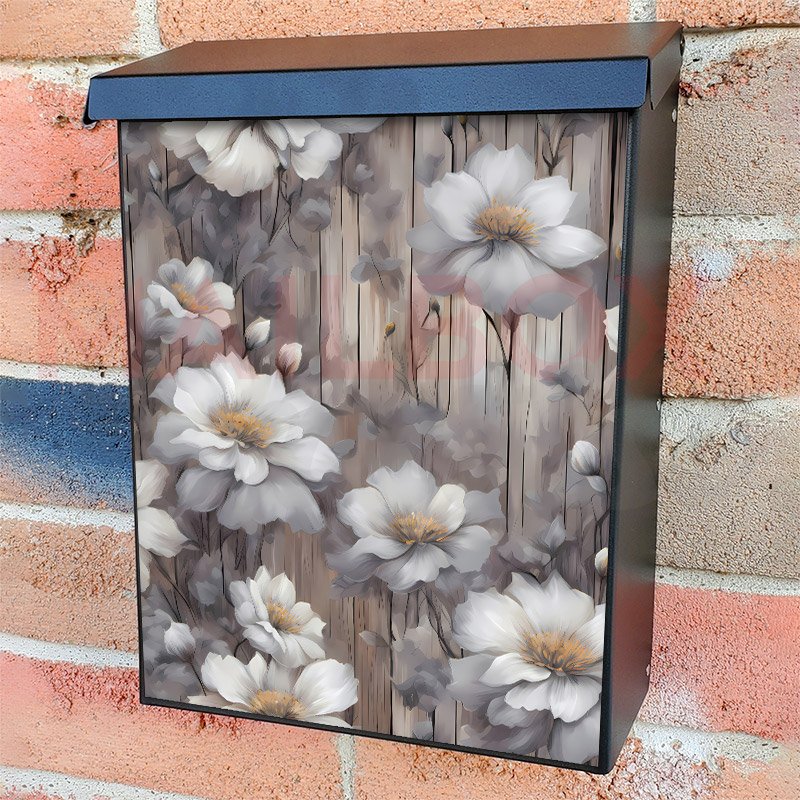 This Grey Flowers on Wood Background mailbox design was created by Krisztina Soos