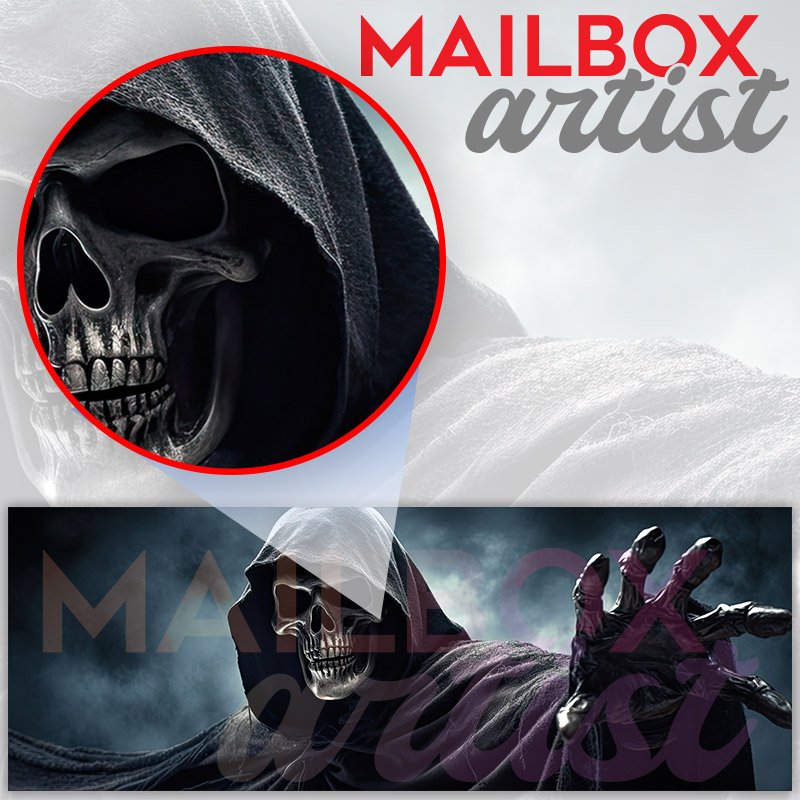 Applying your Grim Reaper Extending Arm Towards Camera townhouse / ranch mailbox cover it’s pretty easy to convert your mailbox to a special and unique item. These covers require a flat surface, so they work with townhouse / ranch mailboxes that do not have any embossed decoration or signs. Magnetic mailbox covers work with steel boxes, for aluminum and plastic boxes we offer the self-adhesive vinyl covers. In case your mailbox doesn’t work with these covers, you can purchase the preinstalled cover on a brand new mailbox as well. Also, you can create your custom townhouse / ranch mailbox cover using you own pictures, adding your name, street number, etc.