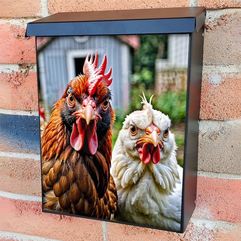 With this Grumpy Rooster and Chicken colonial mailbox cover it’s pretty easy to convert your mailbox to a special and unique item. These covers require a flat surface, so they work with colonial mailboxes that do not have any embossed decoration or signs. Magnetic mailbox covers work with steel colonial boxes only, while self-adhesive vinyl covers are available for aluminum, plastic and steel boxes. We also offer both self-adhesive and magnetic covers with regular opaque white vinyl or reflective vinyl, which works similarly to license plates or road signs. The reflective option makes the entire cover’s surface reflective, ensuring visibility at night. In case your mailbox doesn’t work with these covers, you can purchase the preinstalled cover on a brand new mailbox as well. Also, you can create your custom colonial mailbox cover using you own pictures, adding your name, street number, etc.