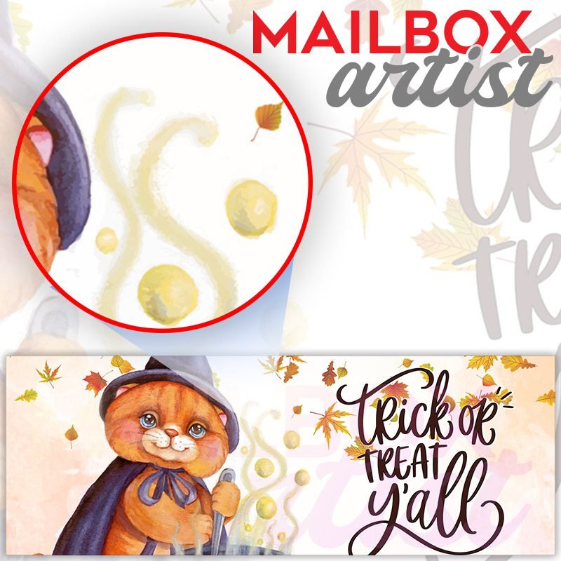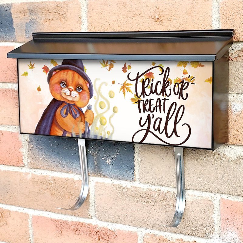 Applying your Halloween Witch Cat townhouse / ranch mailbox cover it’s pretty easy to convert your mailbox to a special and unique item. These covers require a flat surface, so they work with townhouse / ranch mailboxes that do not have any embossed decoration or signs. Magnetic mailbox covers work with steel boxes, for aluminum and plastic boxes we offer the self-adhesive vinyl covers. In case your mailbox doesn’t work with these covers, you can purchase the preinstalled cover on a brand new mailbox as well. Also, you can create your custom townhouse / ranch mailbox cover using you own pictures, adding your name, street number, etc.