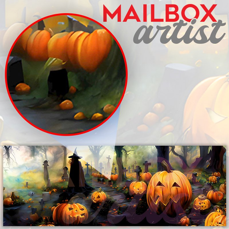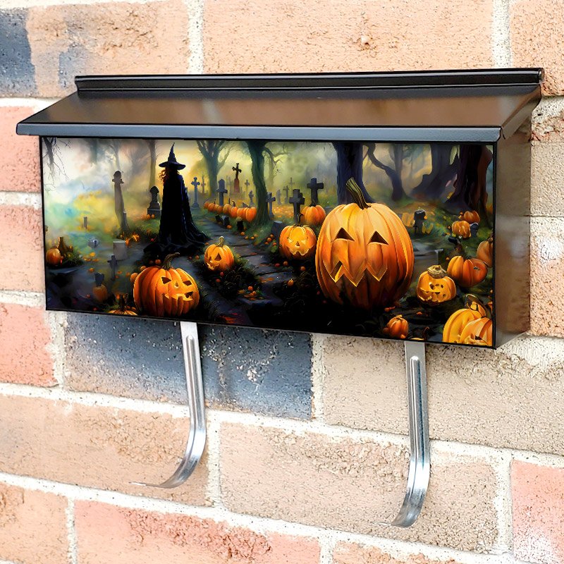 Applying your Halloween Witch in the Cemetery townhouse / ranch mailbox cover it’s pretty easy to convert your mailbox to a special and unique item. These covers require a flat surface, so they work with townhouse / ranch mailboxes that do not have any embossed decoration or signs. Magnetic mailbox covers work with steel boxes, for aluminum and plastic boxes we offer the self-adhesive vinyl covers. In case your mailbox doesn’t work with these covers, you can purchase the preinstalled cover on a brand new mailbox as well. Also, you can create your custom townhouse / ranch mailbox cover using you own pictures, adding your name, street number, etc.