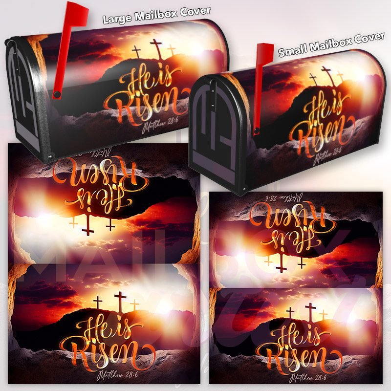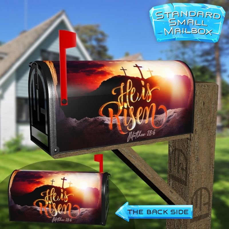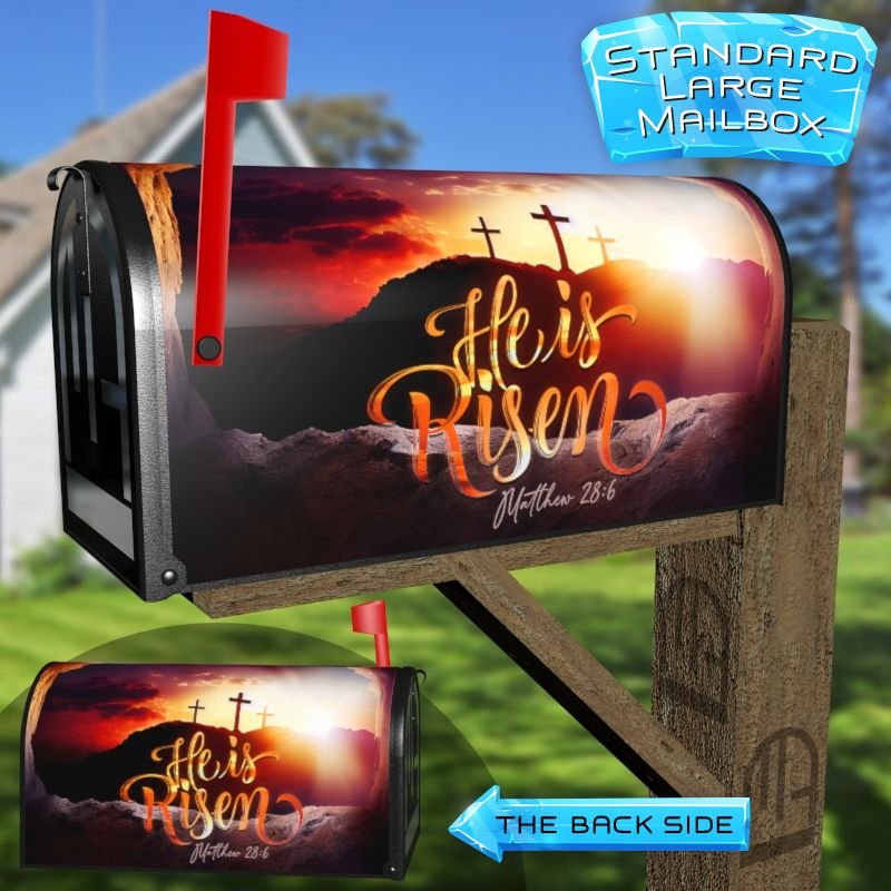 Dressing up your rural farm mailbox with the He is Risen mailbox cover is an easy way to convert it into a unique and special item. These covers require a smooth surface, so they are compatible with rural farm mailboxes that do not have any embossed decorations or signs. Magnetic mailbox covers work with steel boxes only, while self-adhesive vinyl covers are available for aluminum, plastic and steel boxes. If your mailbox is not compatible with these covers, you can purchase a brand new mailbox with a preinstalled cover. Additionally, you have the option to create a custom rural farm mailbox cover with your own pictures, name, street number, etc.
