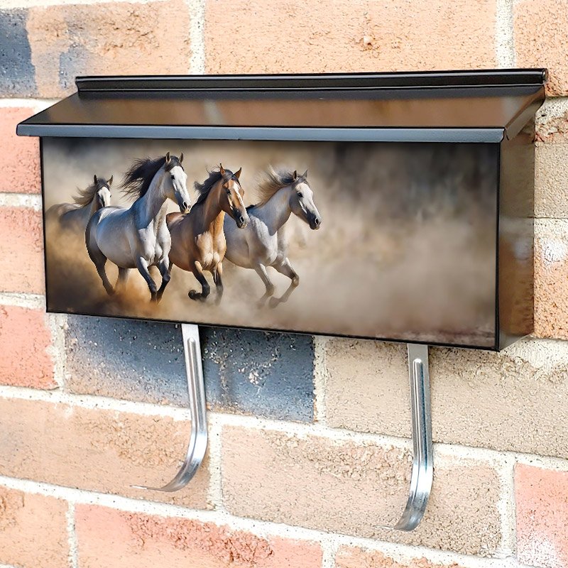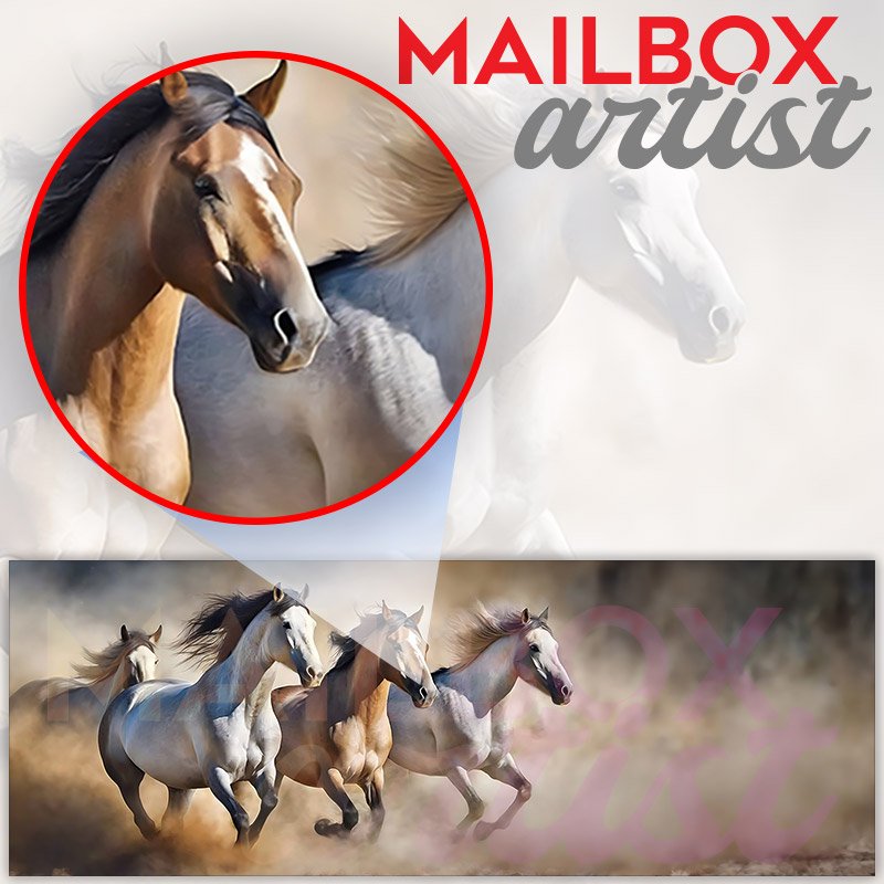Applying your Herd Of Horses Galloping Through Dusty Trail townhouse / ranch mailbox cover it’s pretty easy to convert your mailbox to a special and unique item. These covers require a flat surface, so they work with townhouse / ranch mailboxes that do not have any embossed decoration or signs. Magnetic mailbox covers work with steel boxes, for aluminum and plastic boxes we offer the self-adhesive vinyl covers. In case your mailbox doesn’t work with these covers, you can purchase the preinstalled cover on a brand new mailbox as well. Also, you can create your custom townhouse / ranch mailbox cover using you own pictures, adding your name, street number, etc.