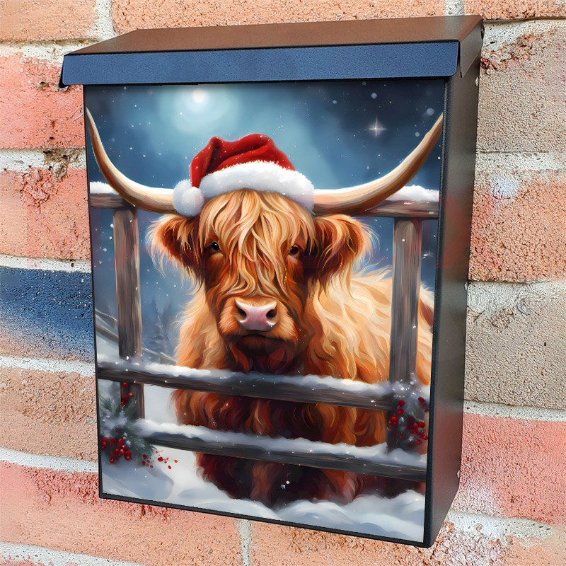 This Highland Cow in Santa Hat mailbox design was created by Krisztina Soos