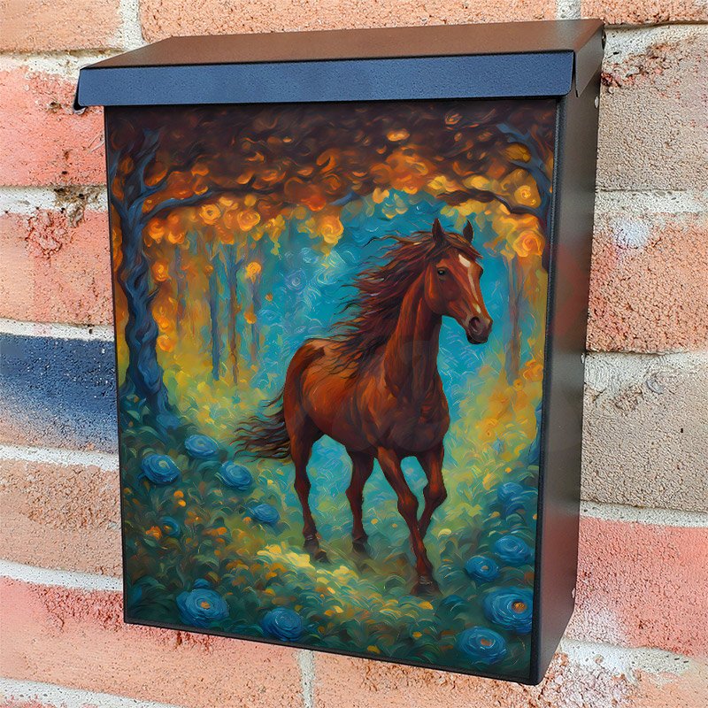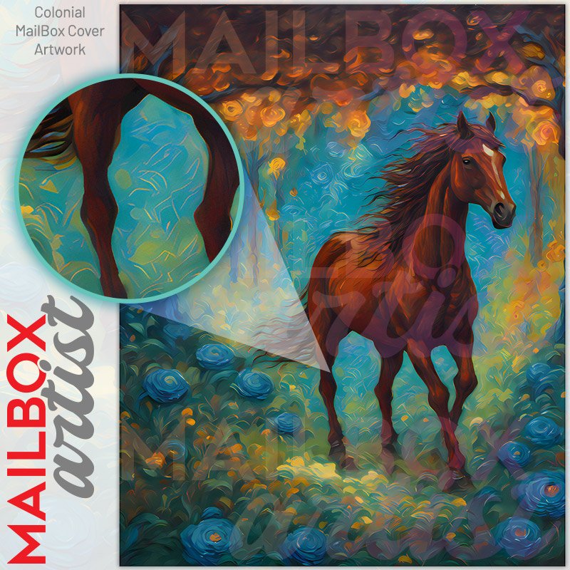 With this Horse in the Fantasy Forest colonial mailbox cover it’s pretty easy to convert your mailbox to a special and unique item. These covers require a flat surface, so they work with colonial mailboxes that do not have any embossed decoration or signs. Magnetic mailbox covers work with steel colonial boxes only, while self-adhesive vinyl covers are available for aluminum, plastic and steel boxes. We also offer both self-adhesive and magnetic covers with regular opaque white vinyl or reflective vinyl, which works similarly to license plates or road signs. The reflective option makes the entire cover’s surface reflective, ensuring visibility at night. In case your mailbox doesn’t work with these covers, you can purchase the preinstalled cover on a brand new mailbox as well. Also, you can create your custom colonial mailbox cover using you own pictures, adding your name, street number, etc.