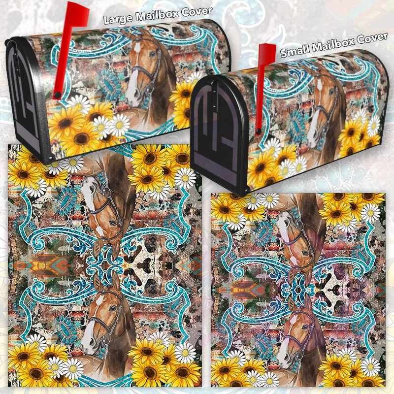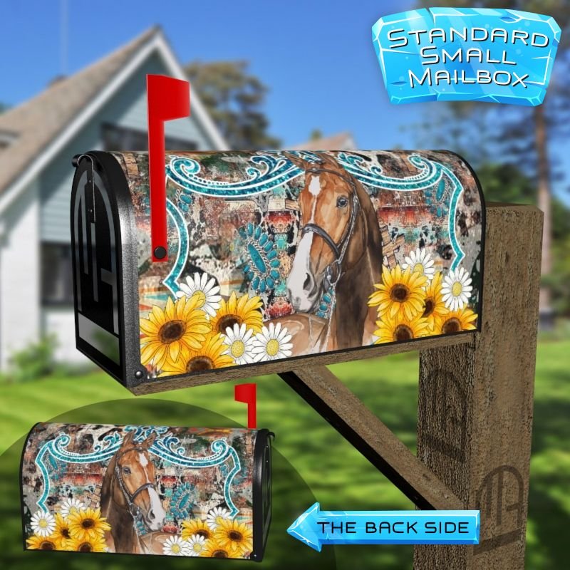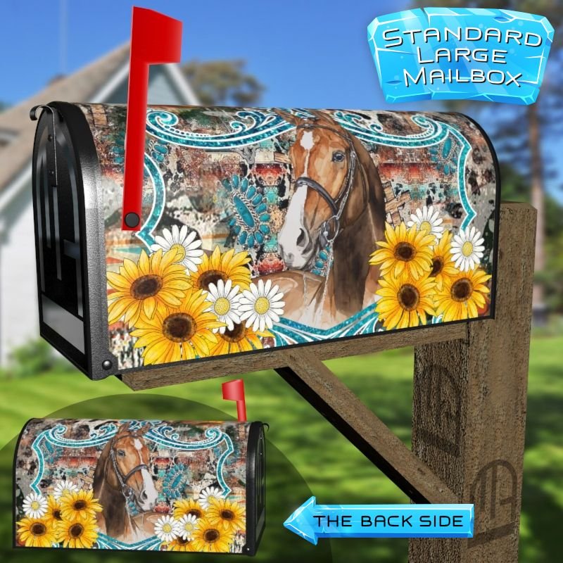 Dressing up your rural farm mailbox with the Horse with Sunflowers mailbox cover is an easy way to convert it into a unique and special item. These covers require a smooth surface, so they are compatible with rural farm mailboxes that do not have any embossed decorations or signs. Magnetic mailbox covers work with steel boxes only, while self-adhesive vinyl covers are available for aluminum, plastic and steel boxes. If your mailbox is not compatible with these covers, you can purchase a brand new mailbox with a preinstalled cover. Additionally, you have the option to create a custom rural farm mailbox cover with your own pictures, name, street number, etc.