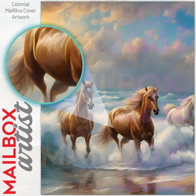 With this Horses Running through the Waves colonial mailbox cover it’s pretty easy to convert your mailbox to a special and unique item. These covers require a flat surface, so they work with colonial mailboxes that do not have any embossed decoration or signs. Magnetic mailbox covers work with steel colonial boxes only, while self-adhesive vinyl covers are available for aluminum, plastic and steel boxes. We also offer both self-adhesive and magnetic covers with regular opaque white vinyl or reflective vinyl, which works similarly to license plates or road signs. The reflective option makes the entire cover’s surface reflective, ensuring visibility at night. In case your mailbox doesn’t work with these covers, you can purchase the preinstalled cover on a brand new mailbox as well. Also, you can create your custom colonial mailbox cover using you own pictures, adding your name, street number, etc.