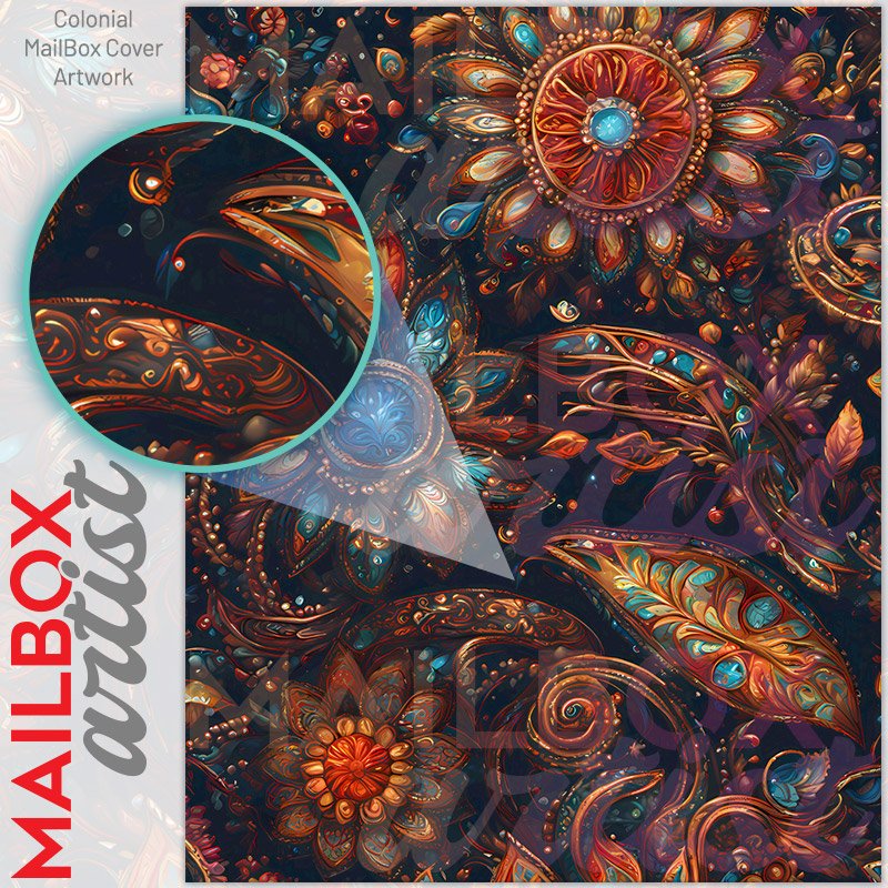 With this Indian Folk Flowers and Leaves colonial mailbox cover it’s pretty easy to convert your mailbox to a special and unique item. These covers require a flat surface, so they work with colonial mailboxes that do not have any embossed decoration or signs. Magnetic mailbox covers work with steel colonial boxes only, while self-adhesive vinyl covers are available for aluminum, plastic and steel boxes. We also offer both self-adhesive and magnetic covers with regular opaque white vinyl or reflective vinyl, which works similarly to license plates or road signs. The reflective option makes the entire cover’s surface reflective, ensuring visibility at night. In case your mailbox doesn’t work with these covers, you can purchase the preinstalled cover on a brand new mailbox as well. Also, you can create your custom colonial mailbox cover using you own pictures, adding your name, street number, etc.