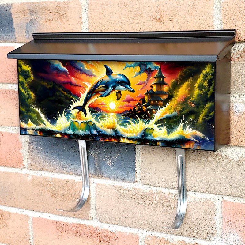 Applying your Jumping Dolphin in the Sunset townhouse / ranch mailbox cover it’s pretty easy to convert your mailbox to a special and unique item. These covers require a flat surface, so they work with townhouse / ranch mailboxes that do not have any embossed decoration or signs. Magnetic mailbox covers work with steel boxes, for aluminum and plastic boxes we offer the self-adhesive vinyl covers. In case your mailbox doesn’t work with these covers, you can purchase the preinstalled cover on a brand new mailbox as well. Also, you can create your custom townhouse / ranch mailbox cover using you own pictures, adding your name, street number, etc.