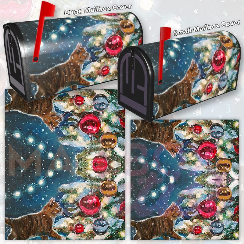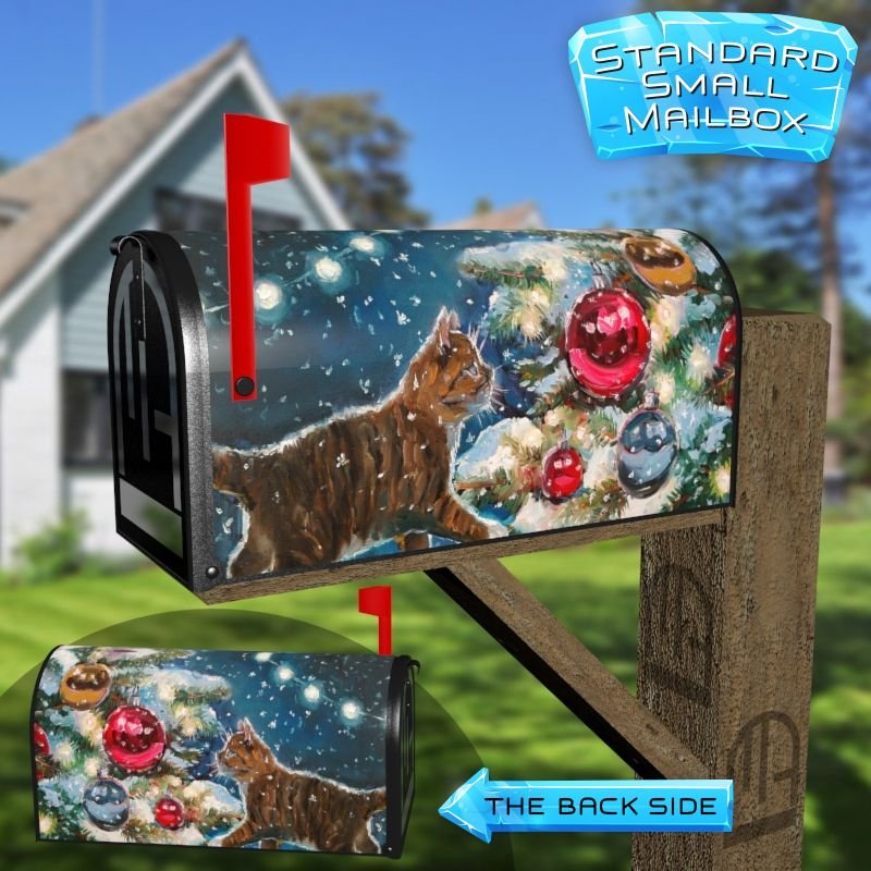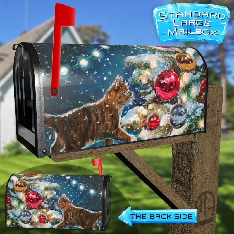 Dressing up your rural farm mailbox with the Kitten and the Christmas Tree #1 mailbox cover is an easy way to convert it into a unique and special item. These covers require a smooth surface, so they are compatible with rural farm mailboxes that do not have any embossed decorations or signs. Magnetic mailbox covers work with steel boxes only, while self-adhesive vinyl covers are available for aluminum, plastic and steel boxes. If your mailbox is not compatible with these covers, you can purchase a brand new mailbox with a preinstalled cover. Additionally, you have the option to create a custom rural farm mailbox cover with your own pictures, name, street number, etc.