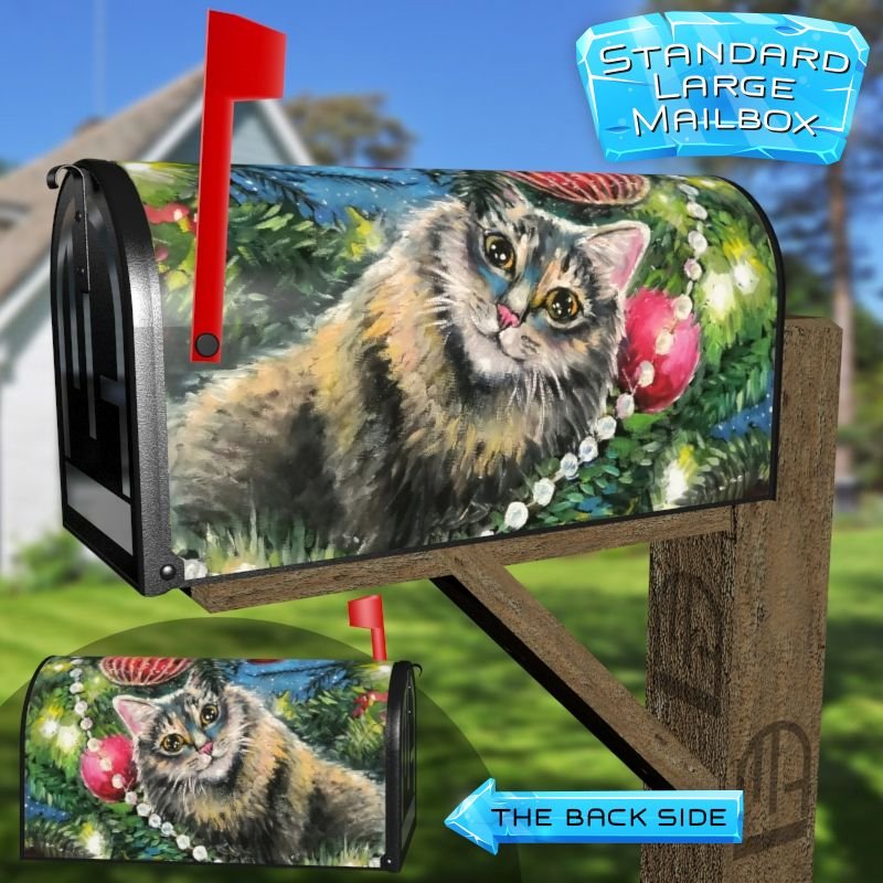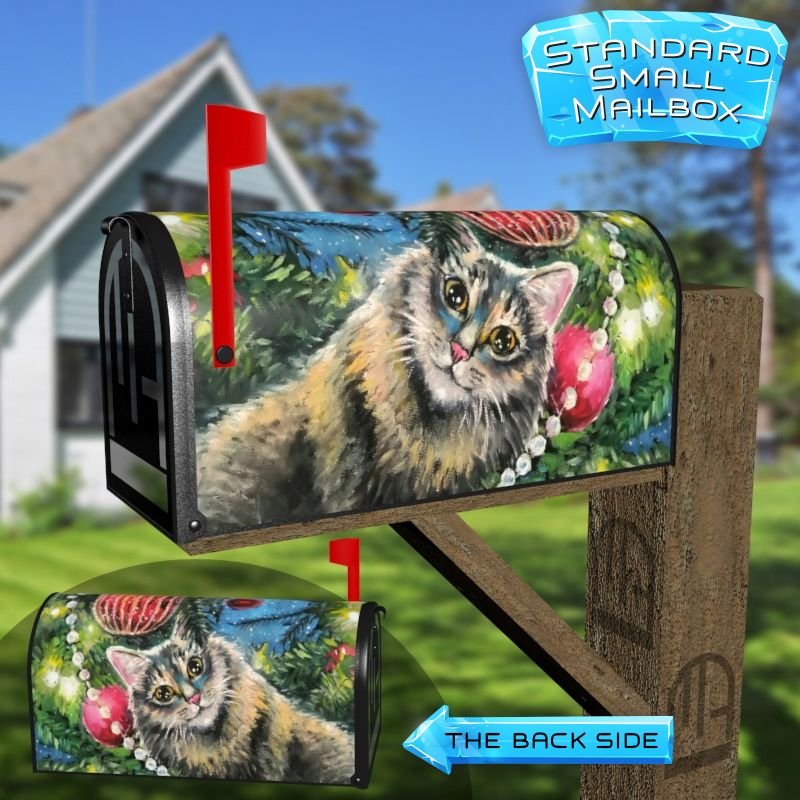 Dressing up your rural farm mailbox with the Kitten and the Christmas Tree #4 mailbox cover is an easy way to convert it into a unique and special item. These covers require a smooth surface, so they are compatible with rural farm mailboxes that do not have any embossed decorations or signs. Magnetic mailbox covers work with steel boxes only, while self-adhesive vinyl covers are available for aluminum, plastic and steel boxes. If your mailbox is not compatible with these covers, you can purchase a brand new mailbox with a preinstalled cover. Additionally, you have the option to create a custom rural farm mailbox cover with your own pictures, name, street number, etc.