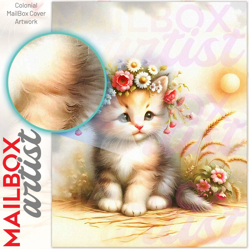 With this Kitten’s First Summer colonial mailbox cover it’s pretty easy to convert your mailbox to a special and unique item. These covers require a flat surface, so they work with colonial mailboxes that do not have any embossed decoration or signs. Magnetic mailbox covers work with steel colonial boxes only, while self-adhesive vinyl covers are available for aluminum, plastic and steel boxes. We also offer both self-adhesive and magnetic covers with regular opaque white vinyl or reflective vinyl, which works similarly to license plates or road signs. The reflective option makes the entire cover’s surface reflective, ensuring visibility at night. In case your mailbox doesn’t work with these covers, you can purchase the preinstalled cover on a brand new mailbox as well. Also, you can create your custom colonial mailbox cover using you own pictures, adding your name, street number, etc.