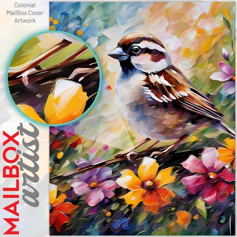 With this Little Colorful Sparrow colonial mailbox cover it’s pretty easy to convert your mailbox to a special and unique item. These covers require a flat surface, so they work with colonial mailboxes that do not have any embossed decoration or signs. Magnetic mailbox covers work with steel colonial boxes only, while self-adhesive vinyl covers are available for aluminum, plastic and steel boxes. We also offer both self-adhesive and magnetic covers with regular opaque white vinyl or reflective vinyl, which works similarly to license plates or road signs. The reflective option makes the entire cover’s surface reflective, ensuring visibility at night. In case your mailbox doesn’t work with these covers, you can purchase the preinstalled cover on a brand new mailbox as well. Also, you can create your custom colonial mailbox cover using you own pictures, adding your name, street number, etc.