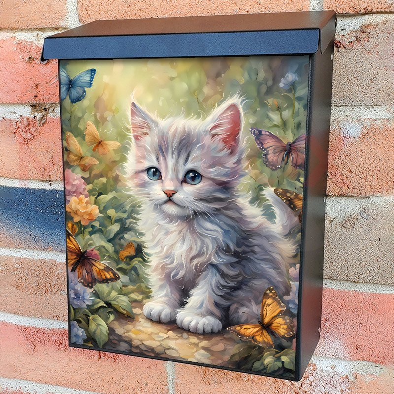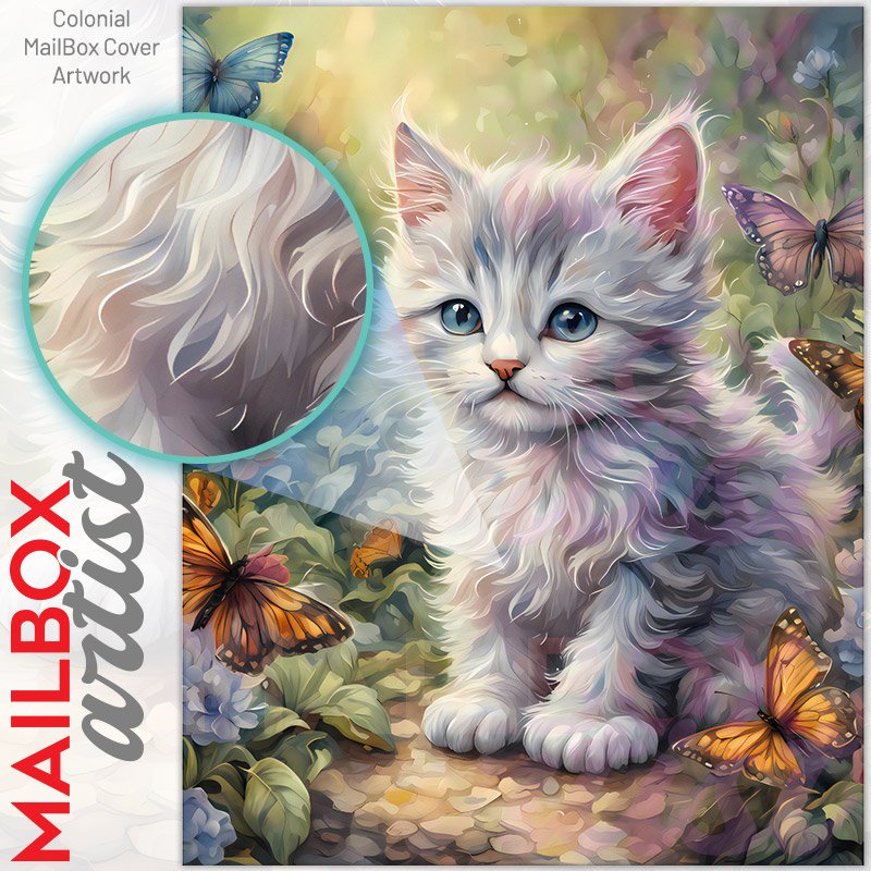 With this Little Kitten in the Garden colonial mailbox cover it’s pretty easy to convert your mailbox to a special and unique item. These covers require a flat surface, so they work with colonial mailboxes that do not have any embossed decoration or signs. Magnetic mailbox covers work with steel colonial boxes only, while self-adhesive vinyl covers are available for aluminum, plastic and steel boxes. We also offer both self-adhesive and magnetic covers with regular opaque white vinyl or reflective vinyl, which works similarly to license plates or road signs. The reflective option makes the entire cover’s surface reflective, ensuring visibility at night. In case your mailbox doesn’t work with these covers, you can purchase the preinstalled cover on a brand new mailbox as well. Also, you can create your custom colonial mailbox cover using you own pictures, adding your name, street number, etc.