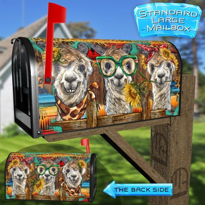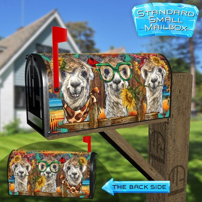 Dressing up your rural farm mailbox with the Llamas over the Fence mailbox cover is an easy way to convert it into a unique and special item. These covers require a smooth surface, so they are compatible with rural farm mailboxes that do not have any embossed decorations or signs. Magnetic mailbox covers work with steel boxes only, while self-adhesive vinyl covers are available for aluminum, plastic and steel boxes. If your mailbox is not compatible with these covers, you can purchase a brand new mailbox with a preinstalled cover. Additionally, you have the option to create a custom rural farm mailbox cover with your own pictures, name, street number, etc.