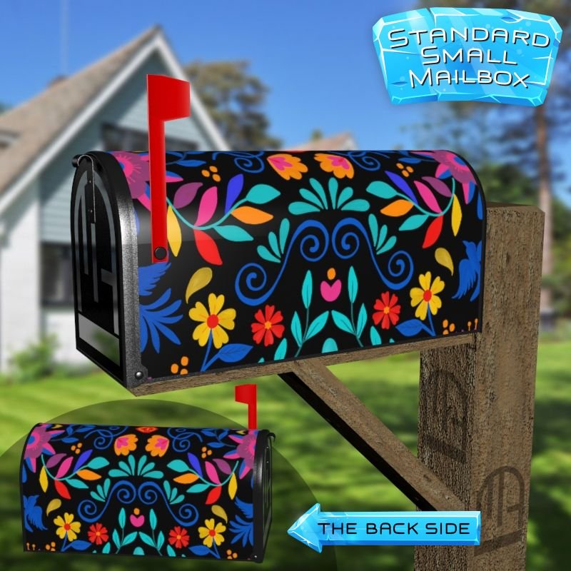 Dressing up your rural farm mailbox with the Mexican Folk Flower Design #4 mailbox cover is an easy way to convert it into a unique and special item. These covers require a smooth surface, so they are compatible with rural farm mailboxes that do not have any embossed decorations or signs. Magnetic mailbox covers work with steel boxes only, while self-adhesive vinyl covers are available for aluminum, plastic and steel boxes. If your mailbox is not compatible with these covers, you can purchase a brand new mailbox with a preinstalled cover. Additionally, you have the option to create a custom rural farm mailbox cover with your own pictures, name, street number, etc.