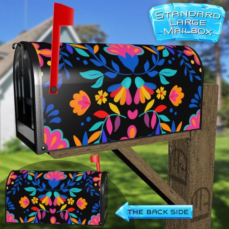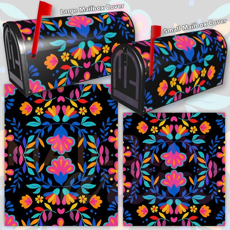 Dressing up your rural farm mailbox with the Mexican Folk Flower Design #5 mailbox cover is an easy way to convert it into a unique and special item. These covers require a smooth surface, so they are compatible with rural farm mailboxes that do not have any embossed decorations or signs. Magnetic mailbox covers work with steel boxes only, while self-adhesive vinyl covers are available for aluminum, plastic and steel boxes. If your mailbox is not compatible with these covers, you can purchase a brand new mailbox with a preinstalled cover. Additionally, you have the option to create a custom rural farm mailbox cover with your own pictures, name, street number, etc.