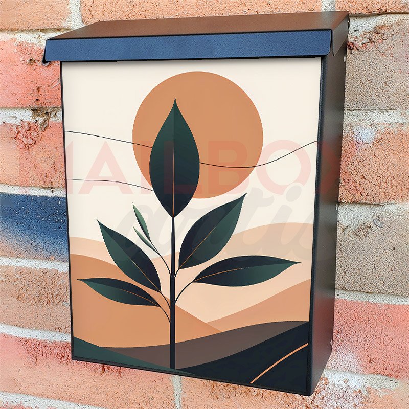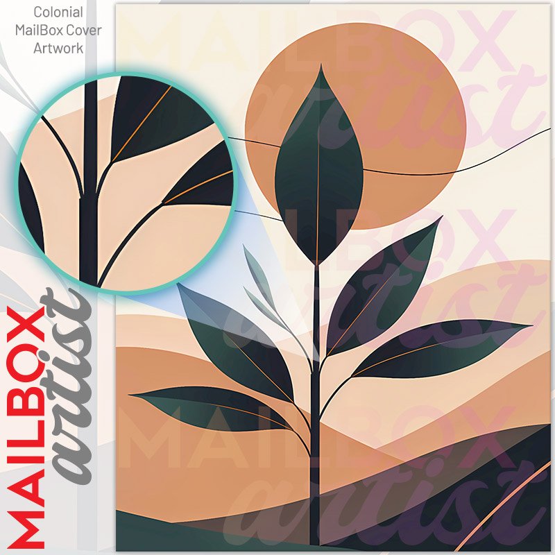 With this Modern Art with a Plant and Sun colonial mailbox cover it’s pretty easy to convert your mailbox to a special and unique item. These covers require a flat surface, so they work with colonial mailboxes that do not have any embossed decoration or signs. Magnetic mailbox covers work with steel colonial boxes only, while self-adhesive vinyl covers are available for aluminum, plastic and steel boxes. We also offer both self-adhesive and magnetic covers with regular opaque white vinyl or reflective vinyl, which works similarly to license plates or road signs. The reflective option makes the entire cover’s surface reflective, ensuring visibility at night. In case your mailbox doesn’t work with these covers, you can purchase the preinstalled cover on a brand new mailbox as well. Also, you can create your custom colonial mailbox cover using you own pictures, adding your name, street number, etc.