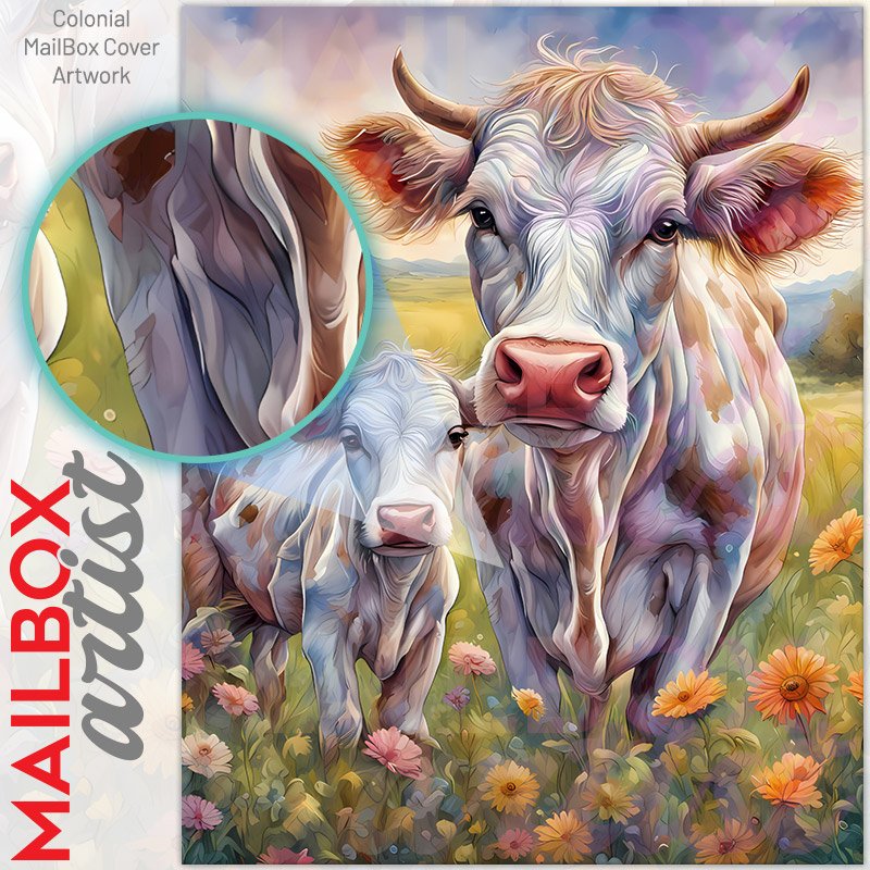 With this Mom and Baby Cow in the Meadow colonial mailbox cover it’s pretty easy to convert your mailbox to a special and unique item. These covers require a flat surface, so they work with colonial mailboxes that do not have any embossed decoration or signs. Magnetic mailbox covers work with steel colonial boxes only, while self-adhesive vinyl covers are available for aluminum, plastic and steel boxes. We also offer both self-adhesive and magnetic covers with regular opaque white vinyl or reflective vinyl, which works similarly to license plates or road signs. The reflective option makes the entire cover’s surface reflective, ensuring visibility at night. In case your mailbox doesn’t work with these covers, you can purchase the preinstalled cover on a brand new mailbox as well. Also, you can create your custom colonial mailbox cover using you own pictures, adding your name, street number, etc.