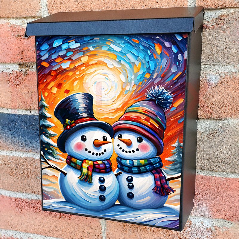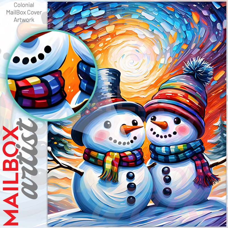 With this Mr. and Mrs. Snowman colonial mailbox cover it’s pretty easy to convert your mailbox to a special and unique item. These covers require a flat surface, so they work with colonial mailboxes that do not have any embossed decoration or signs. Magnetic mailbox covers work with steel colonial boxes only, while self-adhesive vinyl covers are available for aluminum, plastic and steel boxes. We also offer both self-adhesive and magnetic covers with regular opaque white vinyl or reflective vinyl, which works similarly to license plates or road signs. The reflective option makes the entire cover’s surface reflective, ensuring visibility at night. In case your mailbox doesn’t work with these covers, you can purchase the preinstalled cover on a brand new mailbox as well. Also, you can create your custom colonial mailbox cover using you own pictures, adding your name, street number, etc.