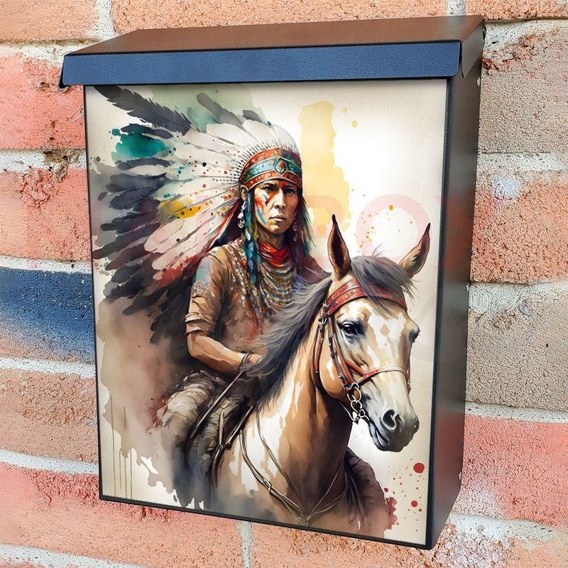 With this Native Warrior on his Horse #2 colonial mailbox cover it’s pretty easy to convert your mailbox to a special and unique item. These covers require a flat surface, so they work with colonial mailboxes that do not have any embossed decoration or signs. In case your mailbox doesn’t work with these covers, you can purchase the preinstalled cover on a brand new mailbox as well. Also, you can create your custom colonial mailbox cover using you own pictures, adding your name, street number, etc.