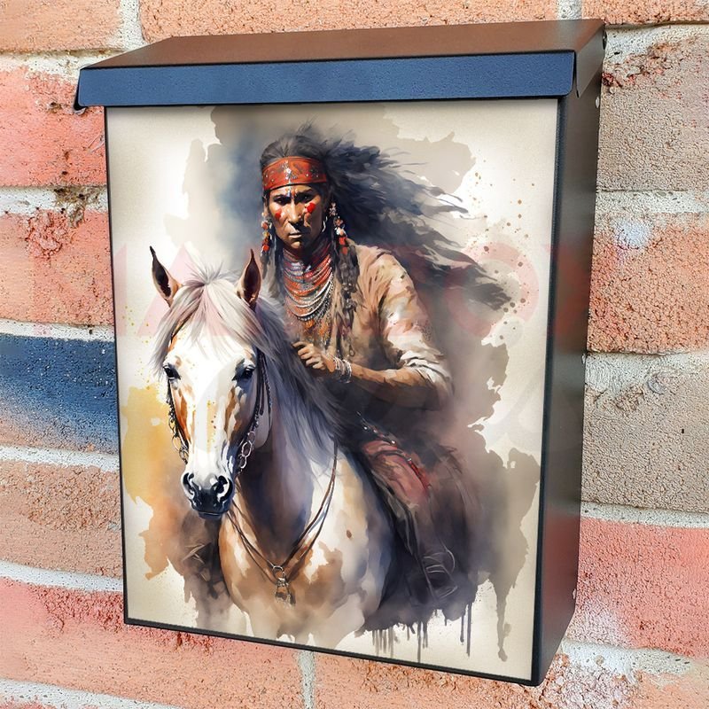 With this Native Warrior on his Horse #7 colonial mailbox cover it’s pretty easy to convert your mailbox to a special and unique item. These covers require a flat surface, so they work with colonial mailboxes that do not have any embossed decoration or signs. In case your mailbox doesn’t work with these covers, you can purchase the preinstalled cover on a brand new mailbox as well. Also, you can create your custom colonial mailbox cover using you own pictures, adding your name, street number, etc.