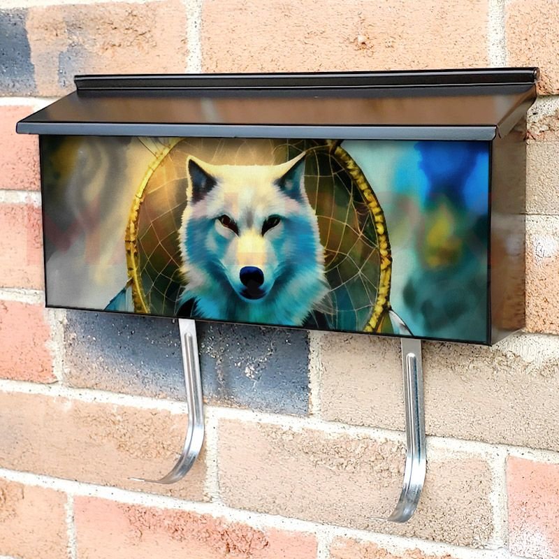 Applying your Native Wolf Dreamcatcher townhouse / ranch mailbox cover it’s pretty easy to convert your mailbox to a special and unique item. These covers require a flat surface, so they work with townhouse / ranch mailboxes that do not have any embossed decoration or signs. Magnetic mailbox covers work with steel boxes, for aluminum and plastic boxes we offer the self-adhesive vinyl covers. In case your mailbox doesn’t work with these covers, you can purchase the preinstalled cover on a brand new mailbox as well. Also, you can create your custom townhouse / ranch mailbox cover using you own pictures, adding your name, street number, etc.