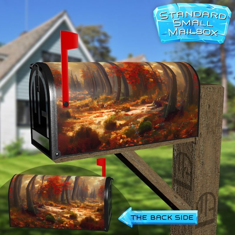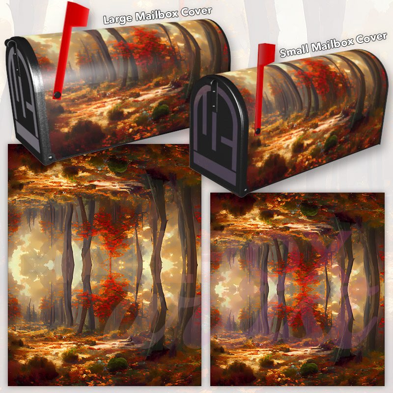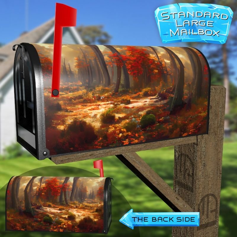 Dressing up your rural farm mailbox with the October Forest #2 mailbox cover is an easy way to convert it into a unique and special item. These covers require a smooth surface, so they are compatible with rural farm mailboxes that do not have any embossed decorations or signs. Magnetic mailbox covers work with steel boxes only, while self-adhesive vinyl covers are available for aluminum, plastic and steel boxes. If your mailbox is not compatible with these covers, you can purchase a brand new mailbox with a preinstalled cover. Additionally, you have the option to create a custom rural farm mailbox cover with your own pictures, name, street number, etc.