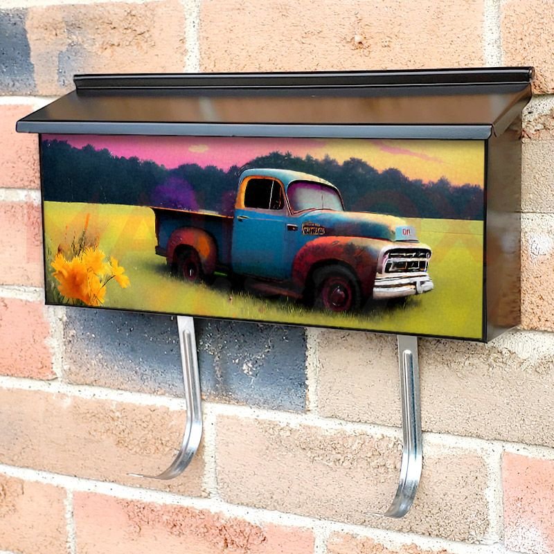 Applying your Old Farmhouse Truck #5 townhouse / ranch mailbox cover it’s pretty easy to convert your mailbox to a special and unique item. These covers require a flat surface, so they work with townhouse / ranch mailboxes that do not have any embossed decoration or signs. Magnetic mailbox covers work with steel boxes, for aluminum and plastic boxes we offer the self-adhesive vinyl covers. In case your mailbox doesn’t work with these covers, you can purchase the preinstalled cover on a brand new mailbox as well. Also, you can create your custom townhouse / ranch mailbox cover using you own pictures, adding your name, street number, etc.
