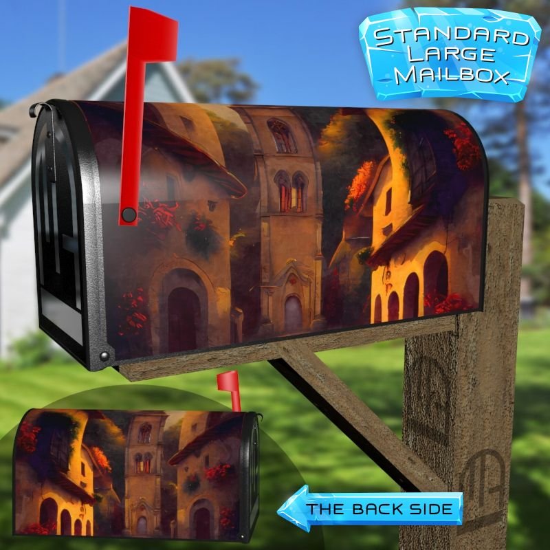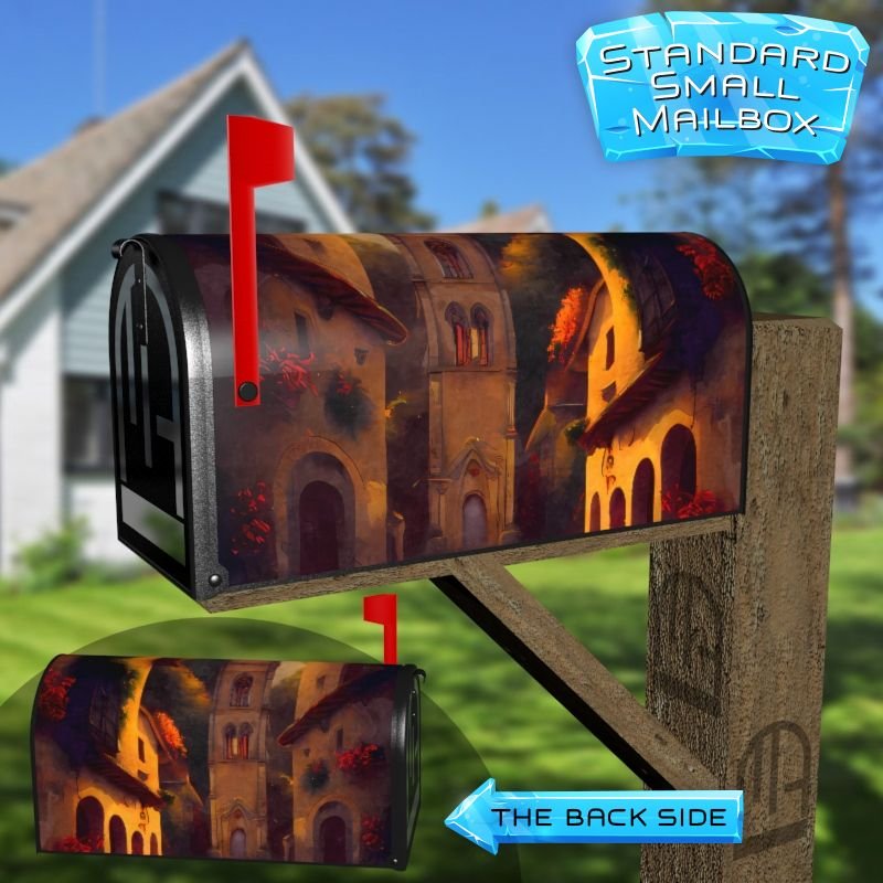Dressing up your rural farm mailbox with the Old Mediterranean City #1 mailbox cover is an easy way to convert it into a unique and special item. These covers require a smooth surface, so they are compatible with rural farm mailboxes that do not have any embossed decorations or signs. Magnetic mailbox covers work with steel boxes only, while self-adhesive vinyl covers are available for aluminum, plastic and steel boxes. If your mailbox is not compatible with these covers, you can purchase a brand new mailbox with a preinstalled cover. Additionally, you have the option to create a custom rural farm mailbox cover with your own pictures, name, street number, etc.