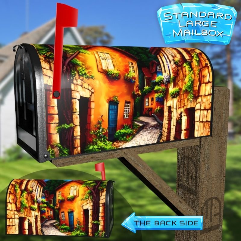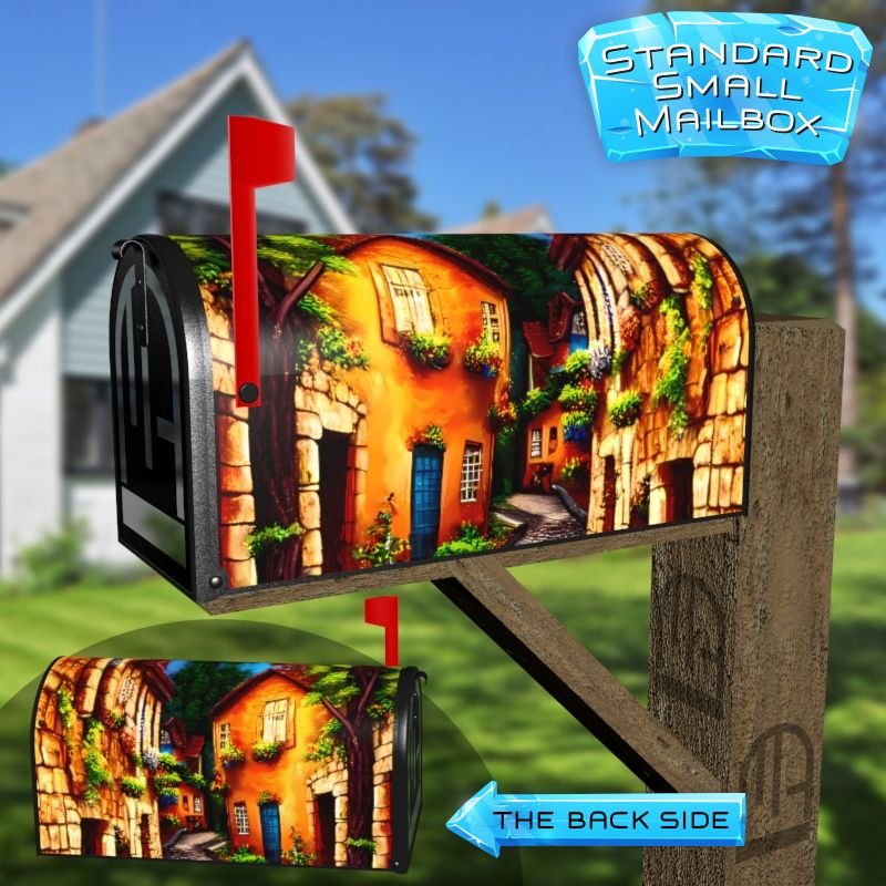 Dressing up your rural farm mailbox with the Old Mediterranean Town #2 mailbox cover is an easy way to convert it into a unique and special item. These covers require a smooth surface, so they are compatible with rural farm mailboxes that do not have any embossed decorations or signs. Magnetic mailbox covers work with steel boxes only, while self-adhesive vinyl covers are available for aluminum, plastic and steel boxes. If your mailbox is not compatible with these covers, you can purchase a brand new mailbox with a preinstalled cover. Additionally, you have the option to create a custom rural farm mailbox cover with your own pictures, name, street number, etc.