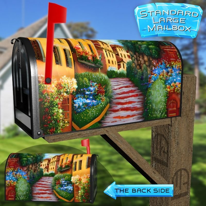 Dressing up your rural farm mailbox with the Old Mediterranean Town #3 mailbox cover is an easy way to convert it into a unique and special item. These covers require a smooth surface, so they are compatible with rural farm mailboxes that do not have any embossed decorations or signs. Magnetic mailbox covers work with steel boxes only, while self-adhesive vinyl covers are available for aluminum, plastic and steel boxes. If your mailbox is not compatible with these covers, you can purchase a brand new mailbox with a preinstalled cover. Additionally, you have the option to create a custom rural farm mailbox cover with your own pictures, name, street number, etc.