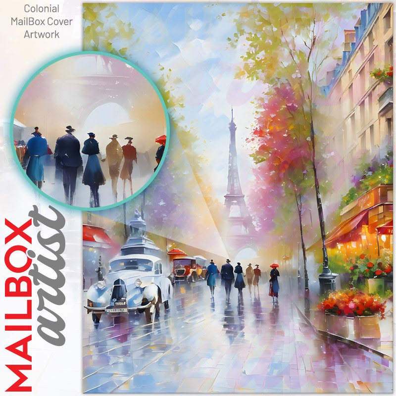 With this Old Street of Paris colonial mailbox cover it’s pretty easy to convert your mailbox to a special and unique item. These covers require a flat surface, so they work with colonial mailboxes that do not have any embossed decoration or signs. Magnetic mailbox covers work with steel colonial boxes only, while self-adhesive vinyl covers are available for aluminum, plastic and steel boxes. We also offer both self-adhesive and magnetic covers with regular opaque white vinyl or reflective vinyl, which works similarly to license plates or road signs. The reflective option makes the entire cover’s surface reflective, ensuring visibility at night. In case your mailbox doesn’t work with these covers, you can purchase the preinstalled cover on a brand new mailbox as well. Also, you can create your custom colonial mailbox cover using you own pictures, adding your name, street number, etc.