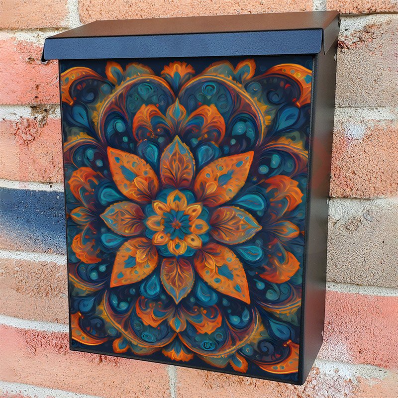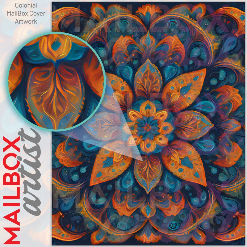 With this Orange and Blue Mandala colonial mailbox cover it’s pretty easy to convert your mailbox to a special and unique item. These covers require a flat surface, so they work with colonial mailboxes that do not have any embossed decoration or signs. Magnetic mailbox covers work with steel colonial boxes only, while self-adhesive vinyl covers are available for aluminum, plastic and steel boxes. We also offer both self-adhesive and magnetic covers with regular opaque white vinyl or reflective vinyl, which works similarly to license plates or road signs. The reflective option makes the entire cover’s surface reflective, ensuring visibility at night. In case your mailbox doesn’t work with these covers, you can purchase the preinstalled cover on a brand new mailbox as well. Also, you can create your custom colonial mailbox cover using you own pictures, adding your name, street number, etc.