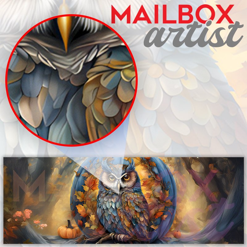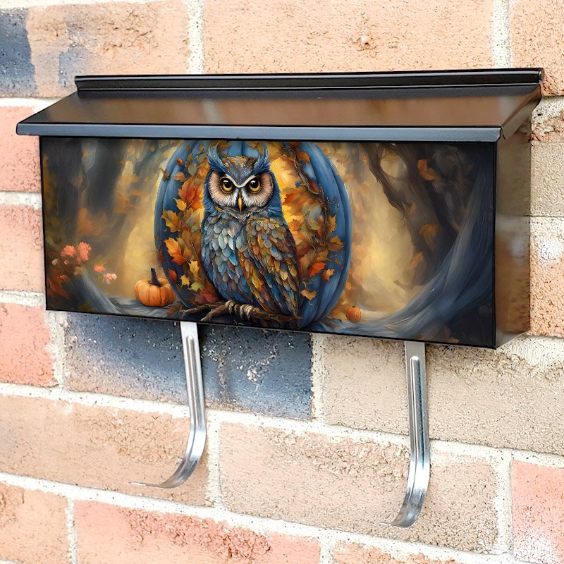 Applying your Owl and the Large Blue Pumpkin townhouse / ranch mailbox cover it’s pretty easy to convert your mailbox to a special and unique item. These covers require a flat surface, so they work with townhouse / ranch mailboxes that do not have any embossed decoration or signs. Magnetic mailbox covers work with steel boxes, for aluminum and plastic boxes we offer the self-adhesive vinyl covers. In case your mailbox doesn’t work with these covers, you can purchase the preinstalled cover on a brand new mailbox as well. Also, you can create your custom townhouse / ranch mailbox cover using you own pictures, adding your name, street number, etc.