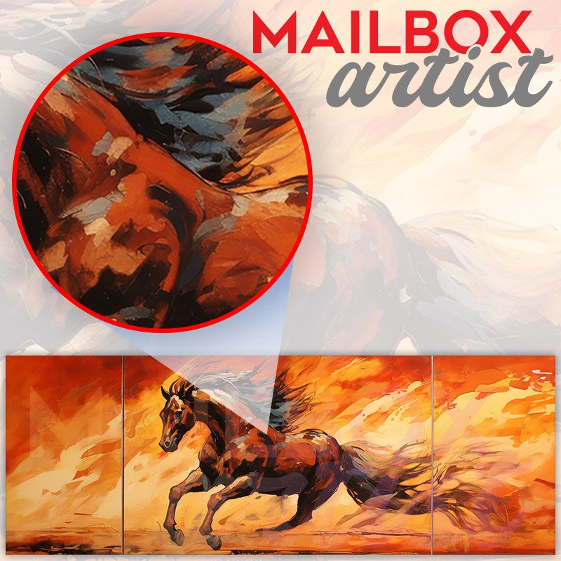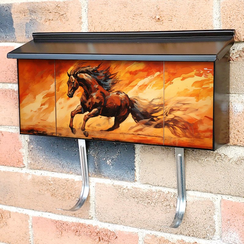 Applying your Painting Of A Horse Galloping townhouse / ranch mailbox cover it’s pretty easy to convert your mailbox to a special and unique item. These covers require a flat surface, so they work with townhouse / ranch mailboxes that do not have any embossed decoration or signs. Magnetic mailbox covers work with steel boxes, for aluminum and plastic boxes we offer the self-adhesive vinyl covers. In case your mailbox doesn’t work with these covers, you can purchase the preinstalled cover on a brand new mailbox as well. Also, you can create your custom townhouse / ranch mailbox cover using you own pictures, adding your name, street number, etc.