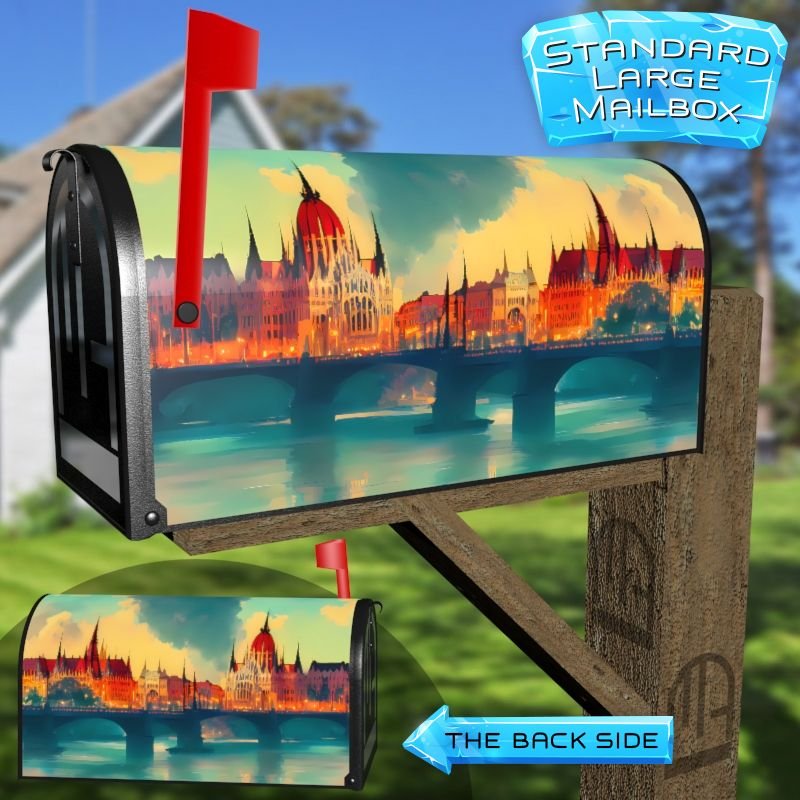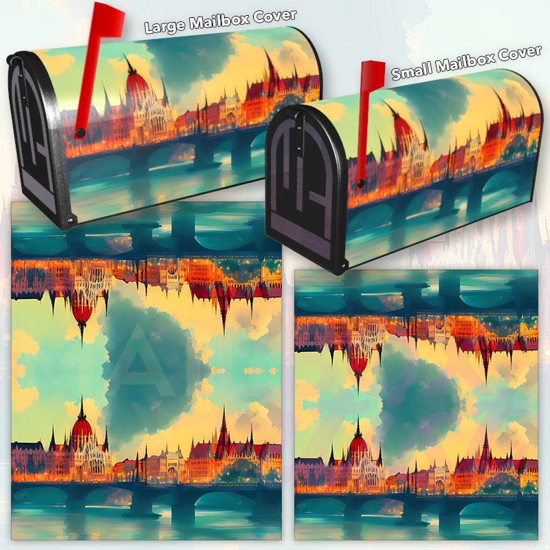 Dressing up your rural farm mailbox with the Parliament in Budapest mailbox cover is an easy way to convert it into a unique and special item. These covers require a smooth surface, so they are compatible with rural farm mailboxes that do not have any embossed decorations or signs. Magnetic mailbox covers work with steel boxes only, while self-adhesive vinyl covers are available for aluminum, plastic and steel boxes. If your mailbox is not compatible with these covers, you can purchase a brand new mailbox with a preinstalled cover. Additionally, you have the option to create a custom rural farm mailbox cover with your own pictures, name, street number, etc.