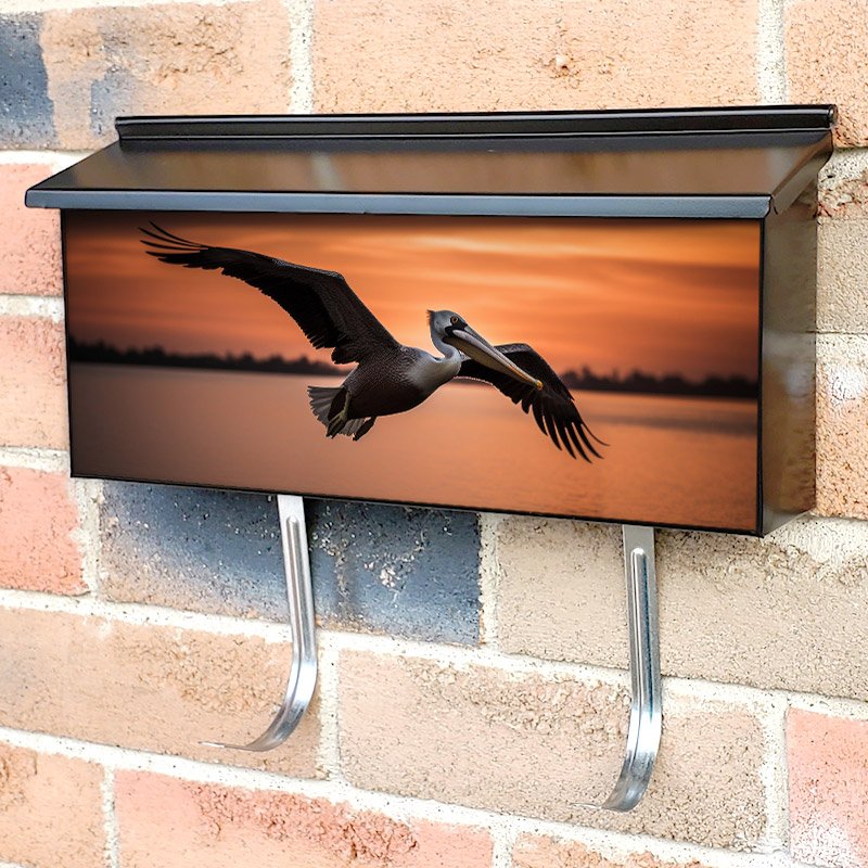 Applying your Pelican Flies Over The Lake townhouse / ranch mailbox cover it’s pretty easy to convert your mailbox to a special and unique item. These covers require a flat surface, so they work with townhouse / ranch mailboxes that do not have any embossed decoration or signs. Magnetic mailbox covers work with steel boxes, for aluminum and plastic boxes we offer the self-adhesive vinyl covers. In case your mailbox doesn’t work with these covers, you can purchase the preinstalled cover on a brand new mailbox as well. Also, you can create your custom townhouse / ranch mailbox cover using you own pictures, adding your name, street number, etc.