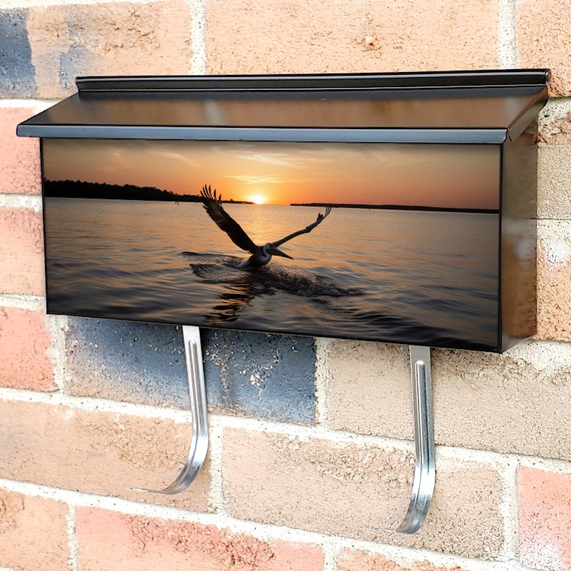 Applying your Pelican Flies Over The Water townhouse / ranch mailbox cover it’s pretty easy to convert your mailbox to a special and unique item. These covers require a flat surface, so they work with townhouse / ranch mailboxes that do not have any embossed decoration or signs. Magnetic mailbox covers work with steel boxes, for aluminum and plastic boxes we offer the self-adhesive vinyl covers. In case your mailbox doesn’t work with these covers, you can purchase the preinstalled cover on a brand new mailbox as well. Also, you can create your custom townhouse / ranch mailbox cover using you own pictures, adding your name, street number, etc.