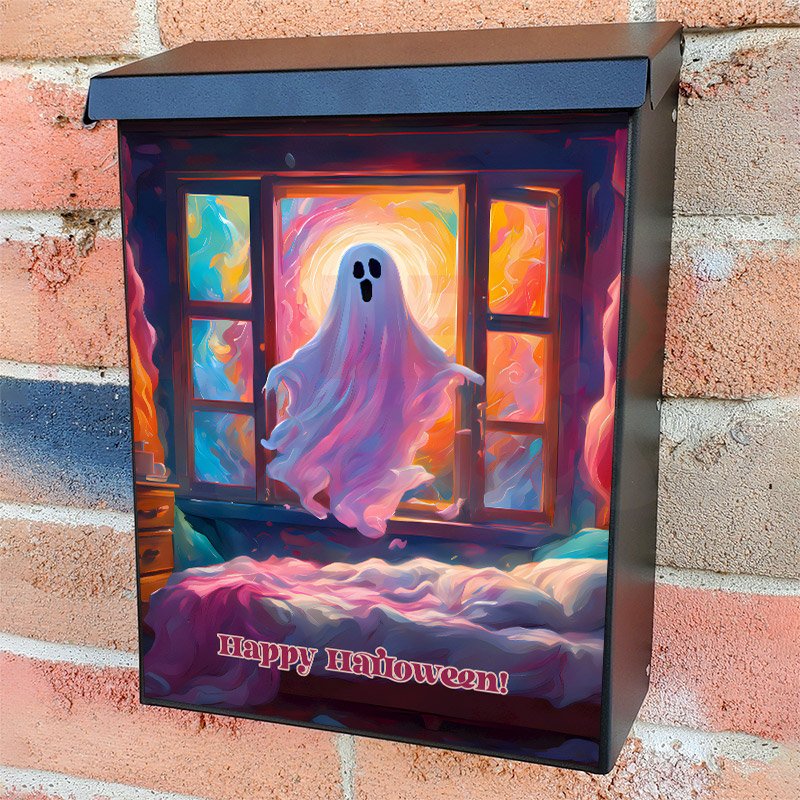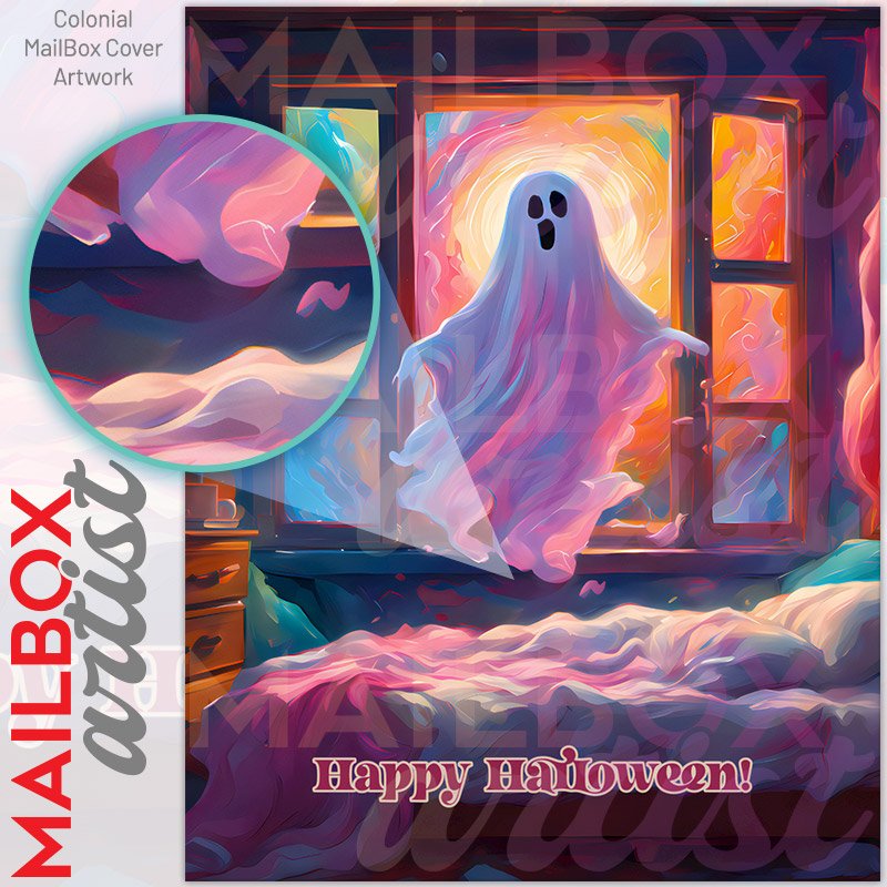 With this Pink Ghost at the Window colonial mailbox cover it’s pretty easy to convert your mailbox to a special and unique item. These covers require a flat surface, so they work with colonial mailboxes that do not have any embossed decoration or signs. Magnetic mailbox covers work with steel colonial boxes only, while self-adhesive vinyl covers are available for aluminum, plastic and steel boxes. We also offer both self-adhesive and magnetic covers with regular opaque white vinyl or reflective vinyl, which works similarly to license plates or road signs. The reflective option makes the entire cover’s surface reflective, ensuring visibility at night. In case your mailbox doesn’t work with these covers, you can purchase the preinstalled cover on a brand new mailbox as well. Also, you can create your custom colonial mailbox cover using you own pictures, adding your name, street number, etc.