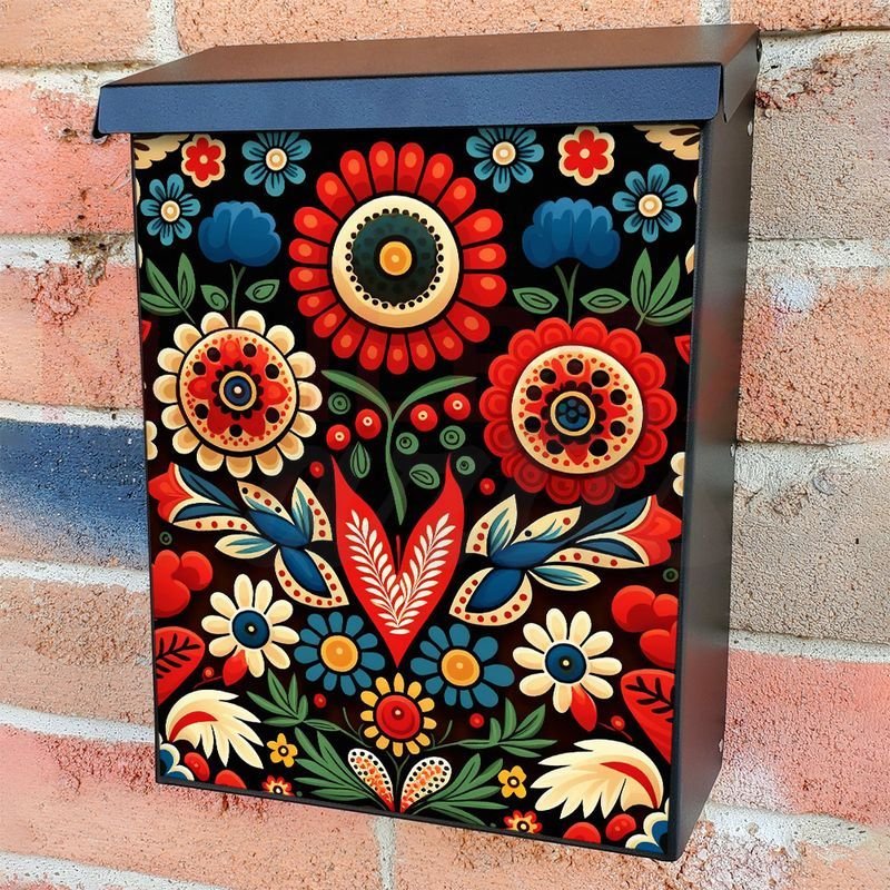 With this Polish Folklore Design #8 colonial mailbox cover it’s pretty easy to convert your mailbox to a special and unique item. These covers require a flat surface, so they work with colonial mailboxes that do not have any embossed decoration or signs. In case your mailbox doesn’t work with these covers, you can purchase the preinstalled cover on a brand new mailbox as well. Also, you can create your custom colonial mailbox cover using you own pictures, adding your name, street number, etc.